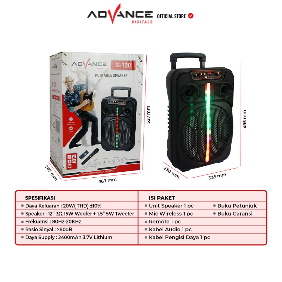 Speaker Bluetooth Karaoke Advance S-120 12 Inch Free Mic Karaoke Wirelles X-Bass