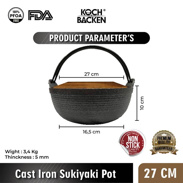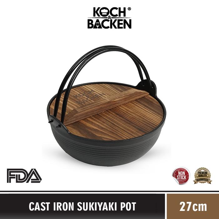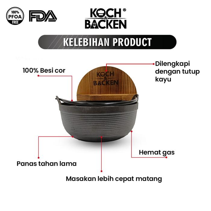 KOCH&BACKEN Cast Iron HotPot 27cm With Wooden Lid Series - Panci Shabu Sukiyaki Besi Cor Murni Anti