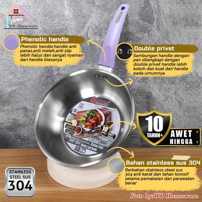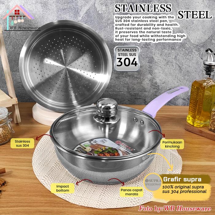 SUPRA New panci Fry pan 24cm + steamer + tutup kaca viliron stainless steel SUS 304 Professional