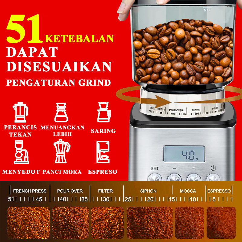LAHOME Electric Conical Burr Coffee Grinder Pabrik Burr Otomatis yang Dapat Disesuaikan dengan 51 Pengaturan Grind yang