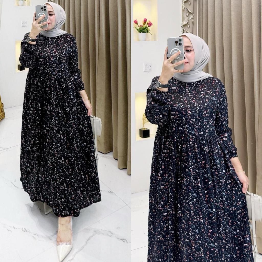 Gamis Midi Dress Rayon Premium Resleting Busui Lengan Karet Wanita Muslimah
