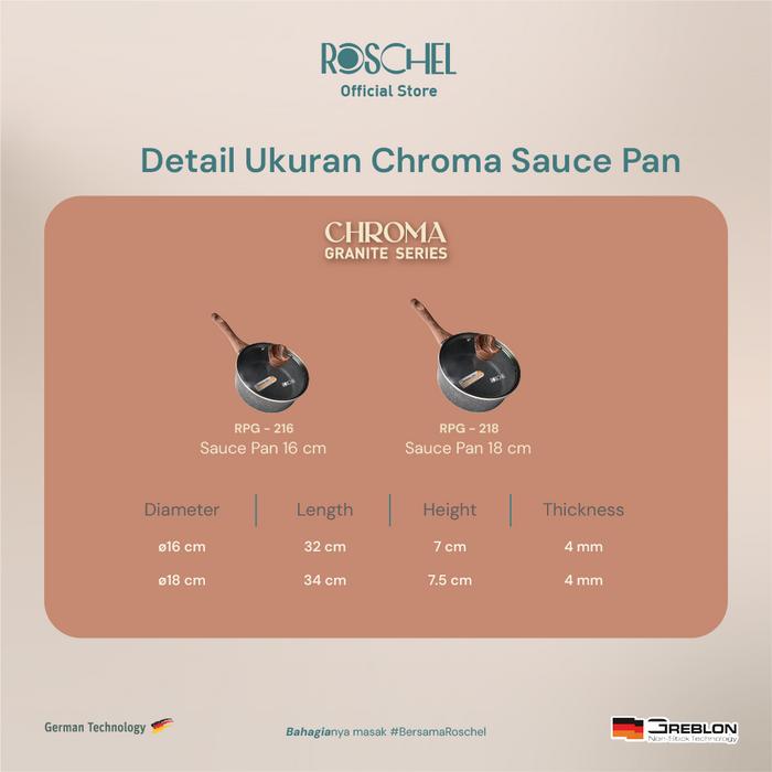 Roschel Chroma Granite Saucepan 16 cm + Tutup Kaca Non-Stick Greblon C3 German Coating Panci Susu