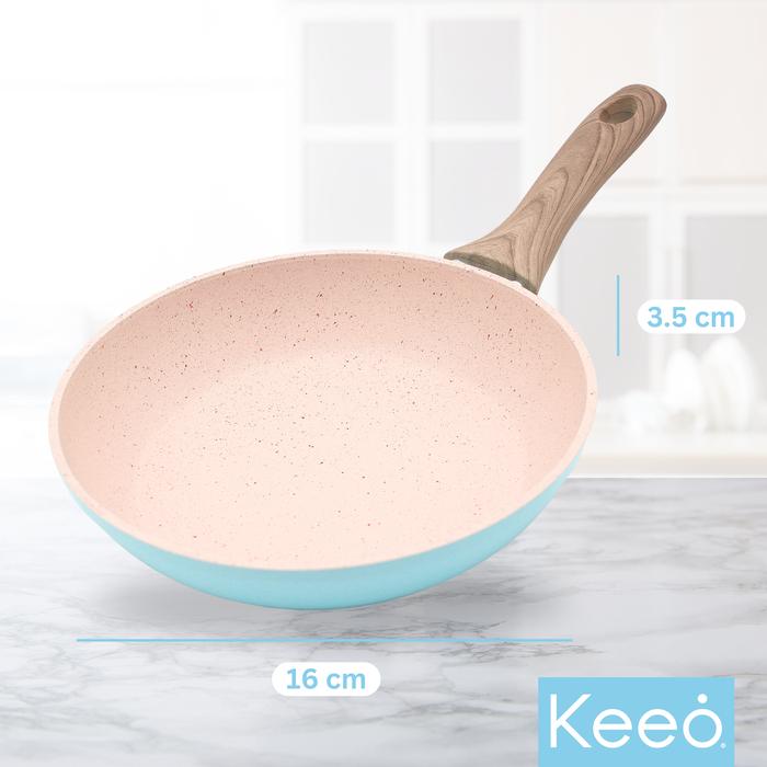 Keeo 16 cm Panci, Wajan Teflon dan Tutup Anti Lengket Marble Granit (Sauce Pan) Bundling MPASI Biru