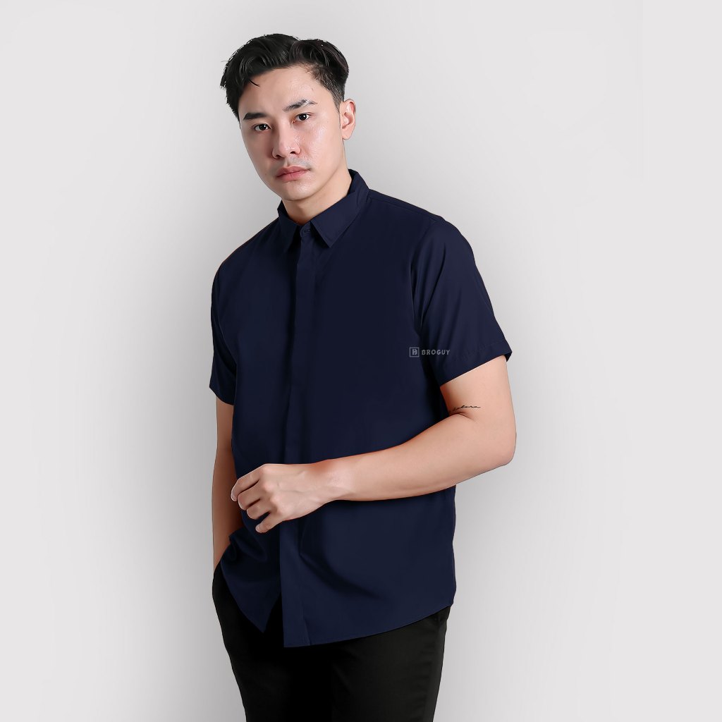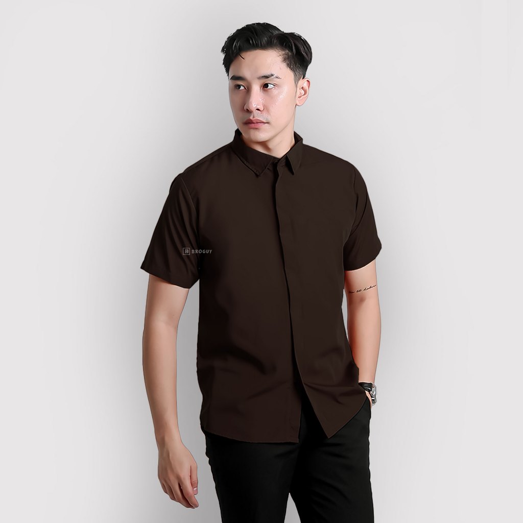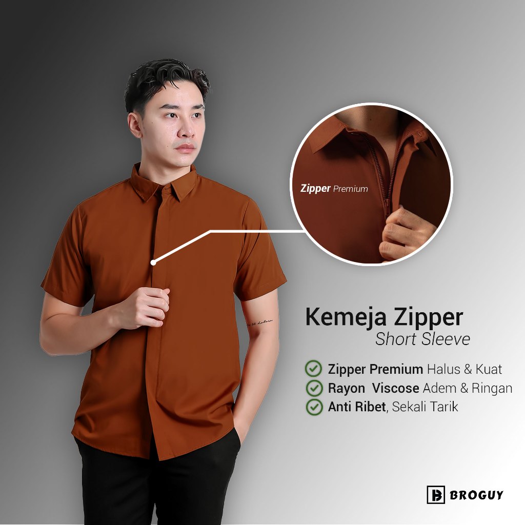 BROGUY Kemeja Zipper Pria Simple Lengan Pendek