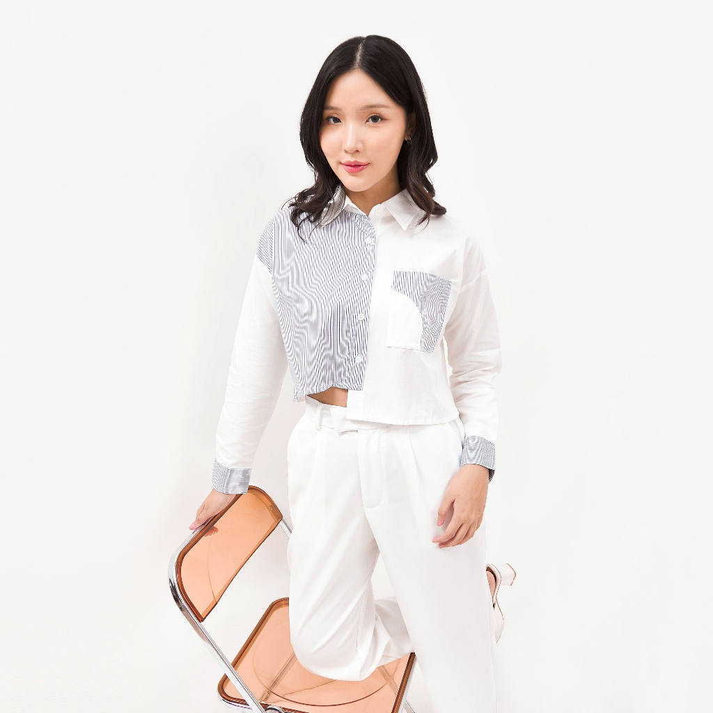 QUEENTIN Kemeja Wanita Asimetris 1038 Katun Poplin Polos Salur Lengan Panjang