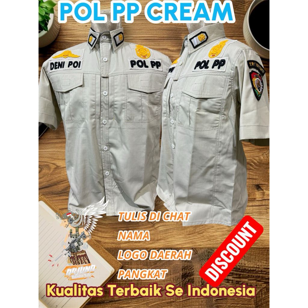 Kemeja Cream Satpol Pp Pendek +Atribut BORDIR TIMBUL 3D