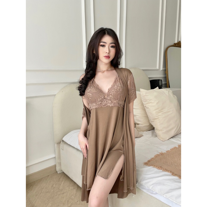 Chelsii Sleepwear Dress Kimono + Panties + Belt in Mocca Color