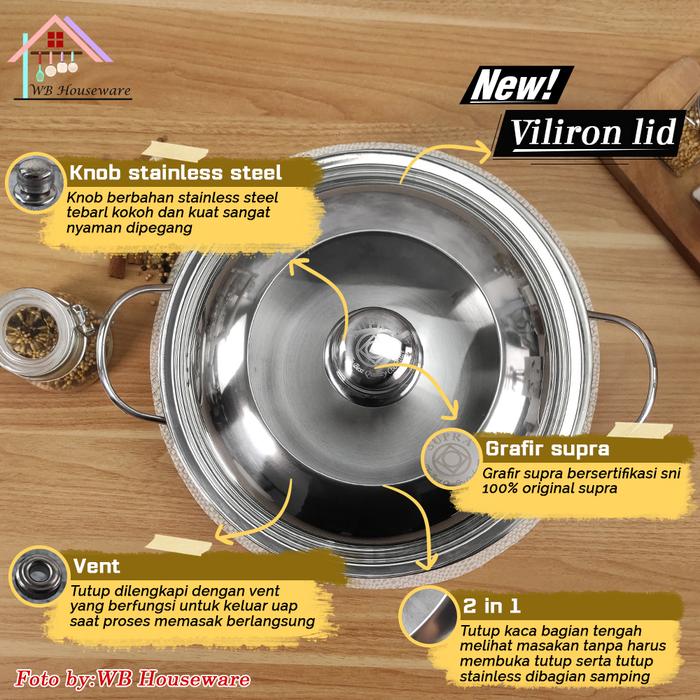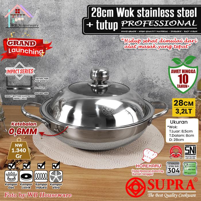 SUPRA wok 28cm + tutup kaca kombinasi stainless steel impact SUS 304 professional series / panci