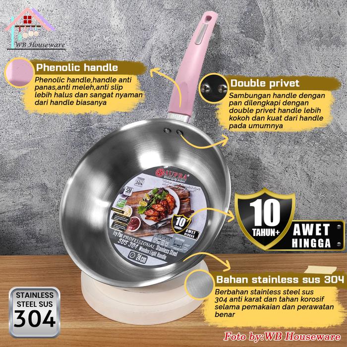 SUPRA Panci Fry pan 24cm + tutup kaca stainless SUS 304 professional series handle pastel pink