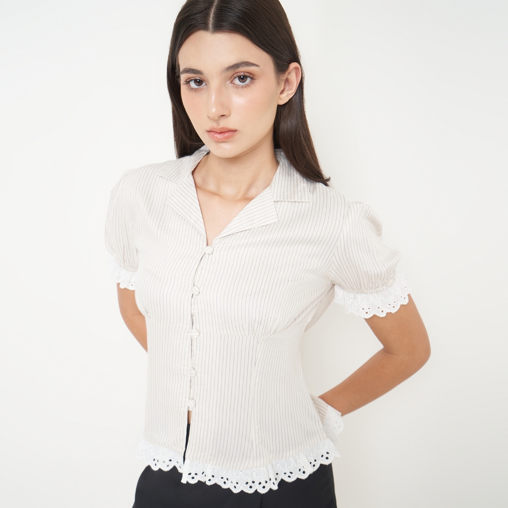 CALEA Sienna Blouse Stripe Fitted katun premium Atasan Wanita Lengan Pendek Renda Bunga tangan Puff