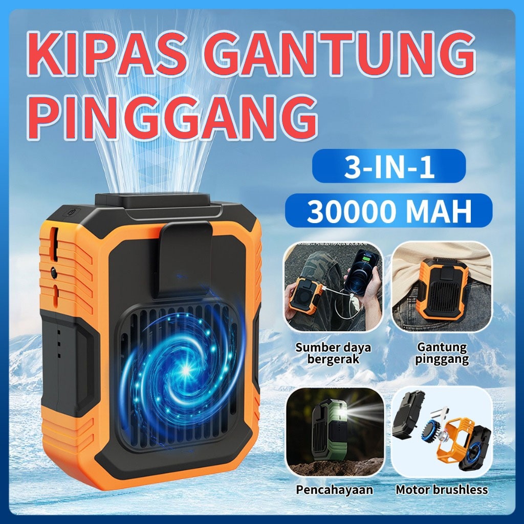 3 in 1 Kipas Angin Portable 30000mAh AC portabel Kapasitas Besar Mini Fans 3 kecepatan Bisa gantung di pinggang Penggunaan sehari penuh dengan sekali pengisian daya Tahan air dan tahan jatuh Kipas