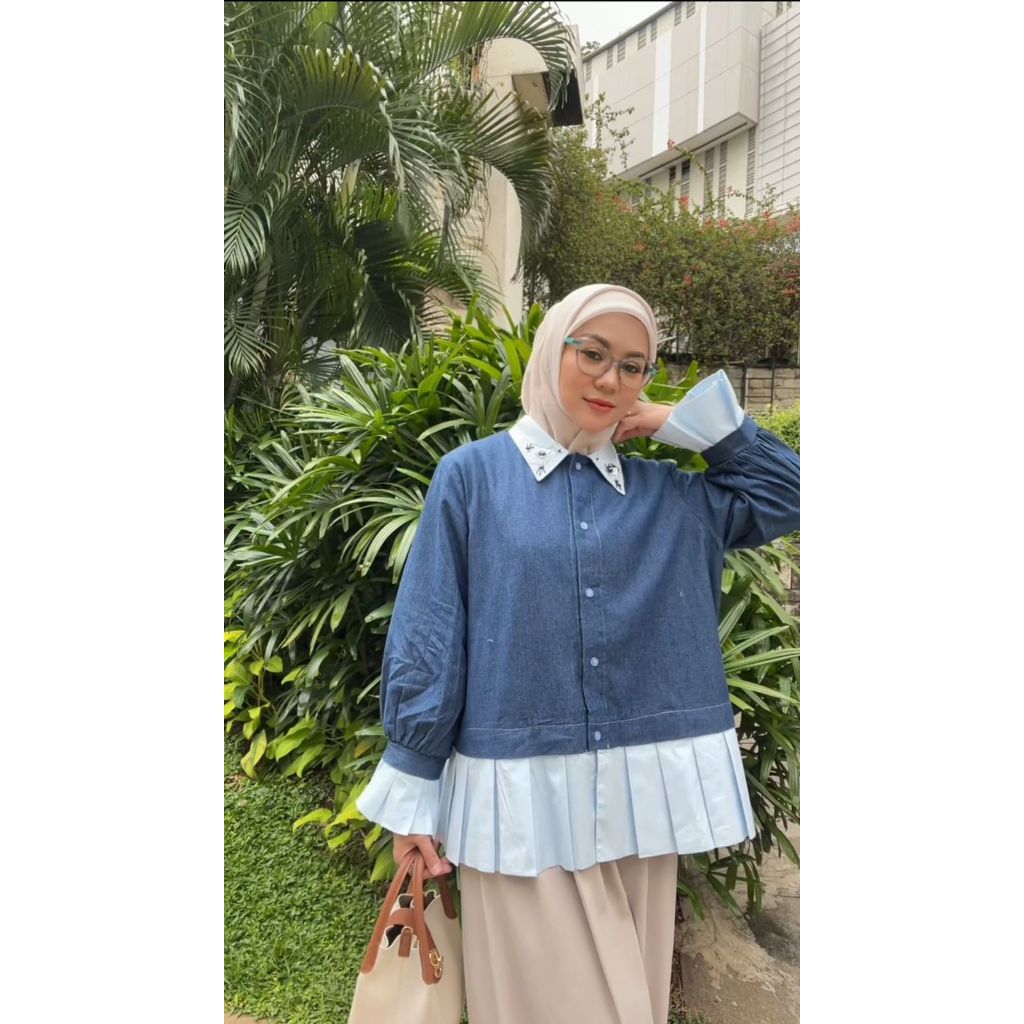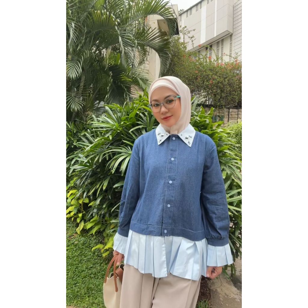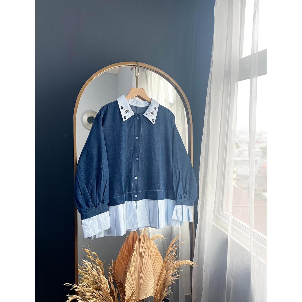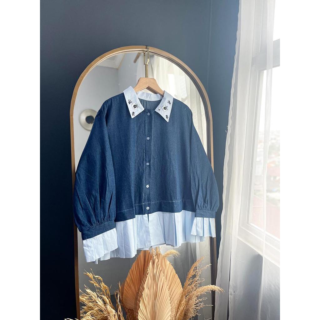 Hello Bestie - Ravel Shirt LD 114cm - Kemeja Wanita Lengan Panjang Atasan Variasi Payet Denim Mix Katun Casual