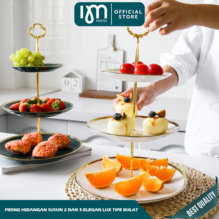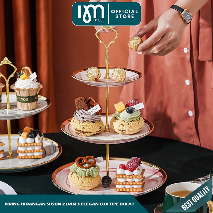INMINDHOUSE Piring Kue Tingkat Keramik List Gold/Double Layer Dessert Cake/Piring Kue Tingkat Mewah