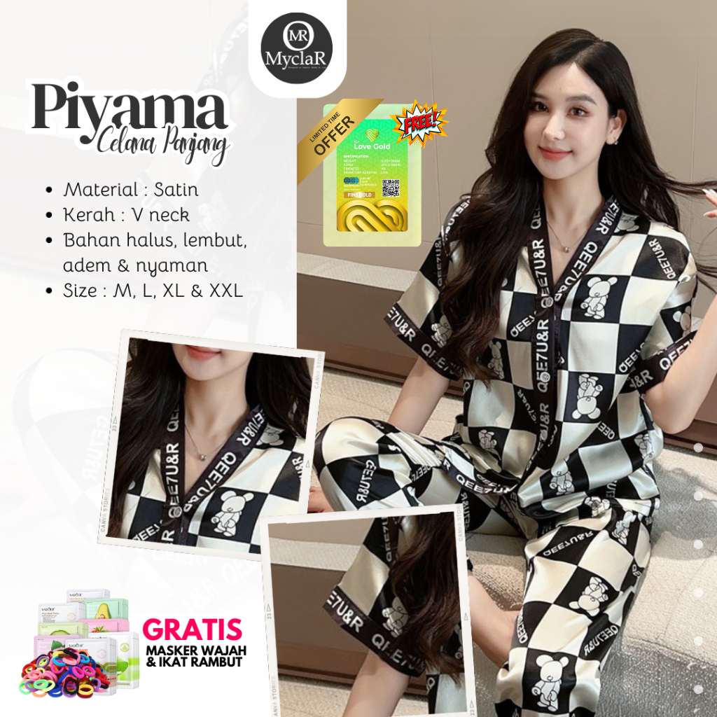 Baju Tidur Wanita Satu Set Piyama Pajamas Setelan Impor Celana Panjang Satin Premium Lengan Pendek