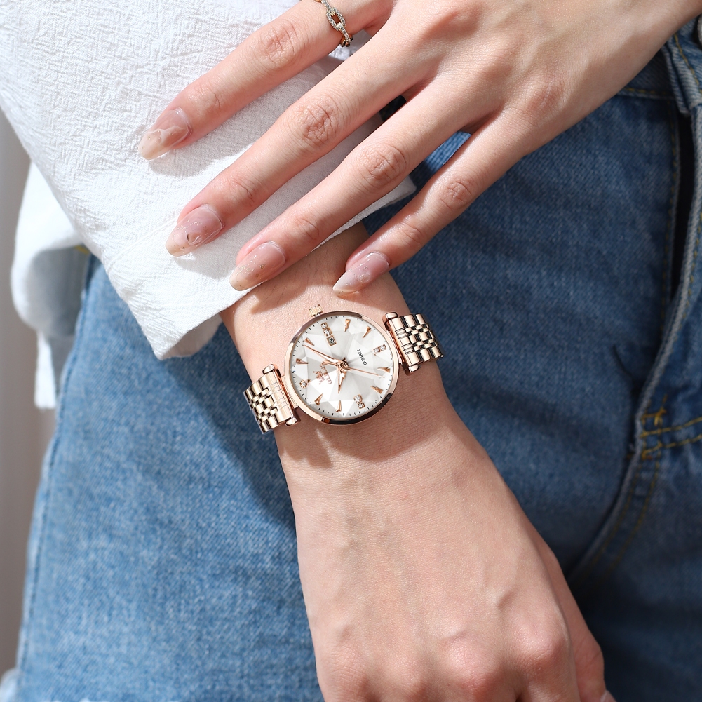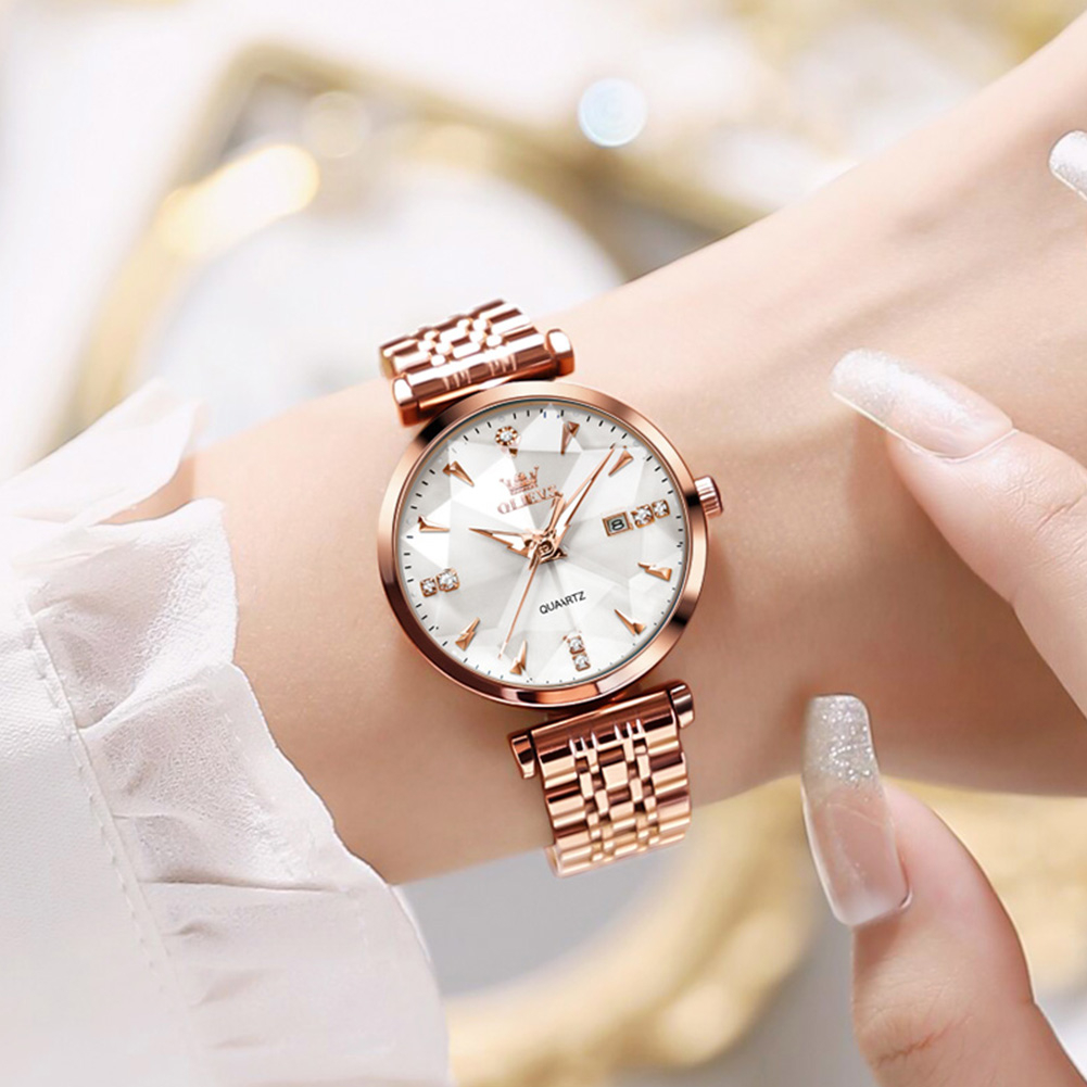 OLEVS Jam Tangan Wanita Anti Air Original Terbaru Korea Permukaan Cermin Prismatik Stainless Steel Watch Women