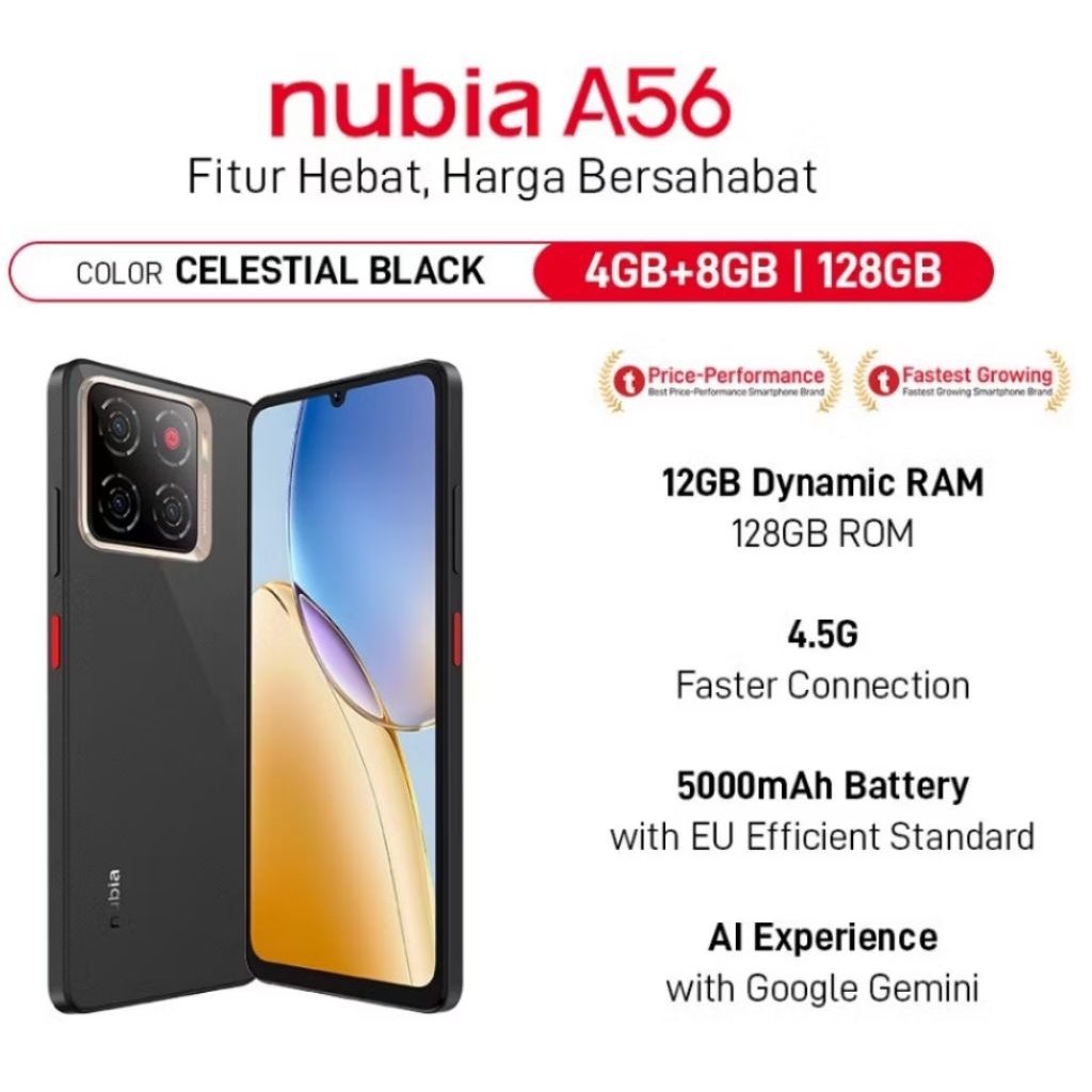 Handphone nubia a56 4/128 Kamera AI 13MP Triple Camera Layar 6.75" 90Hz, Baterai 5000mAh Fast Charging