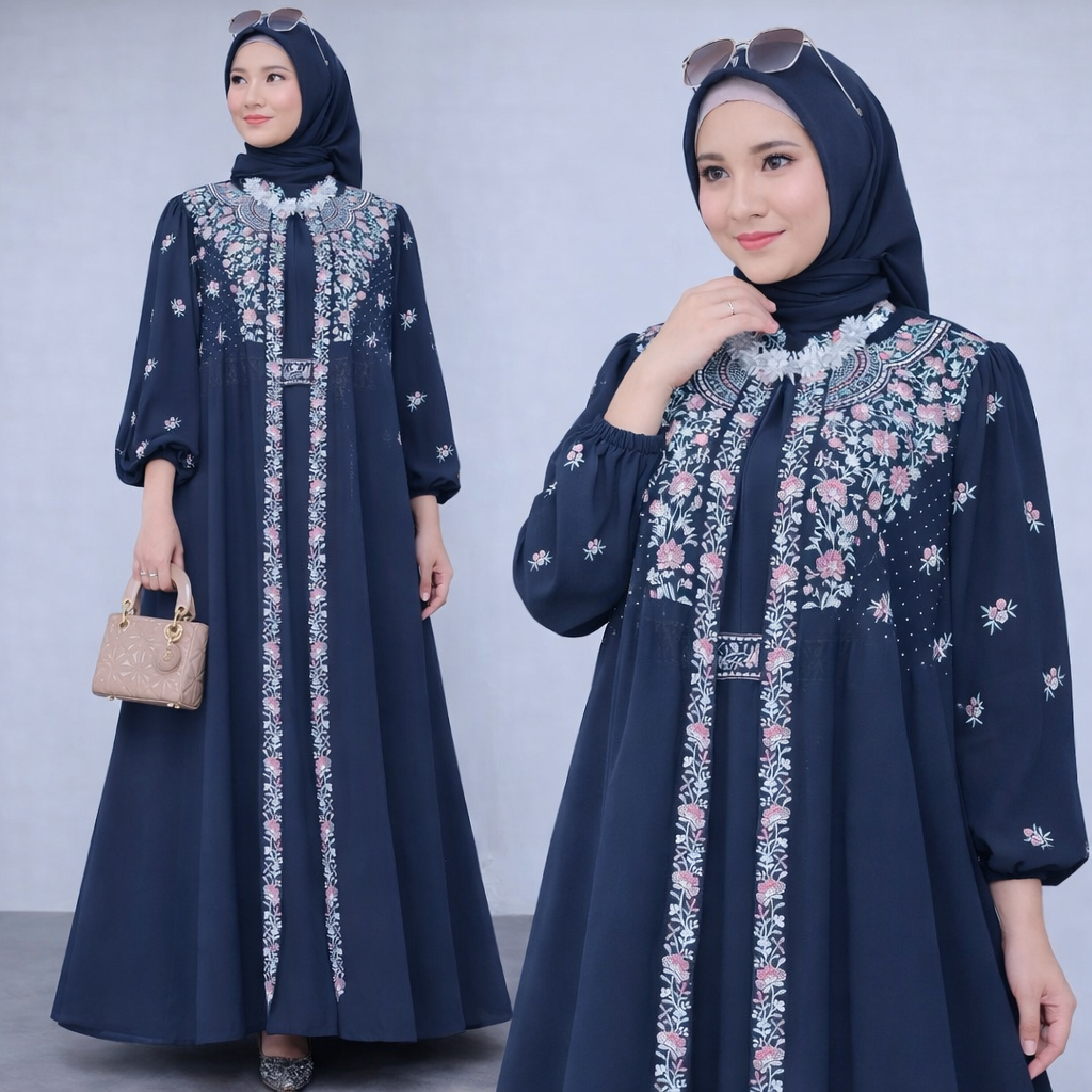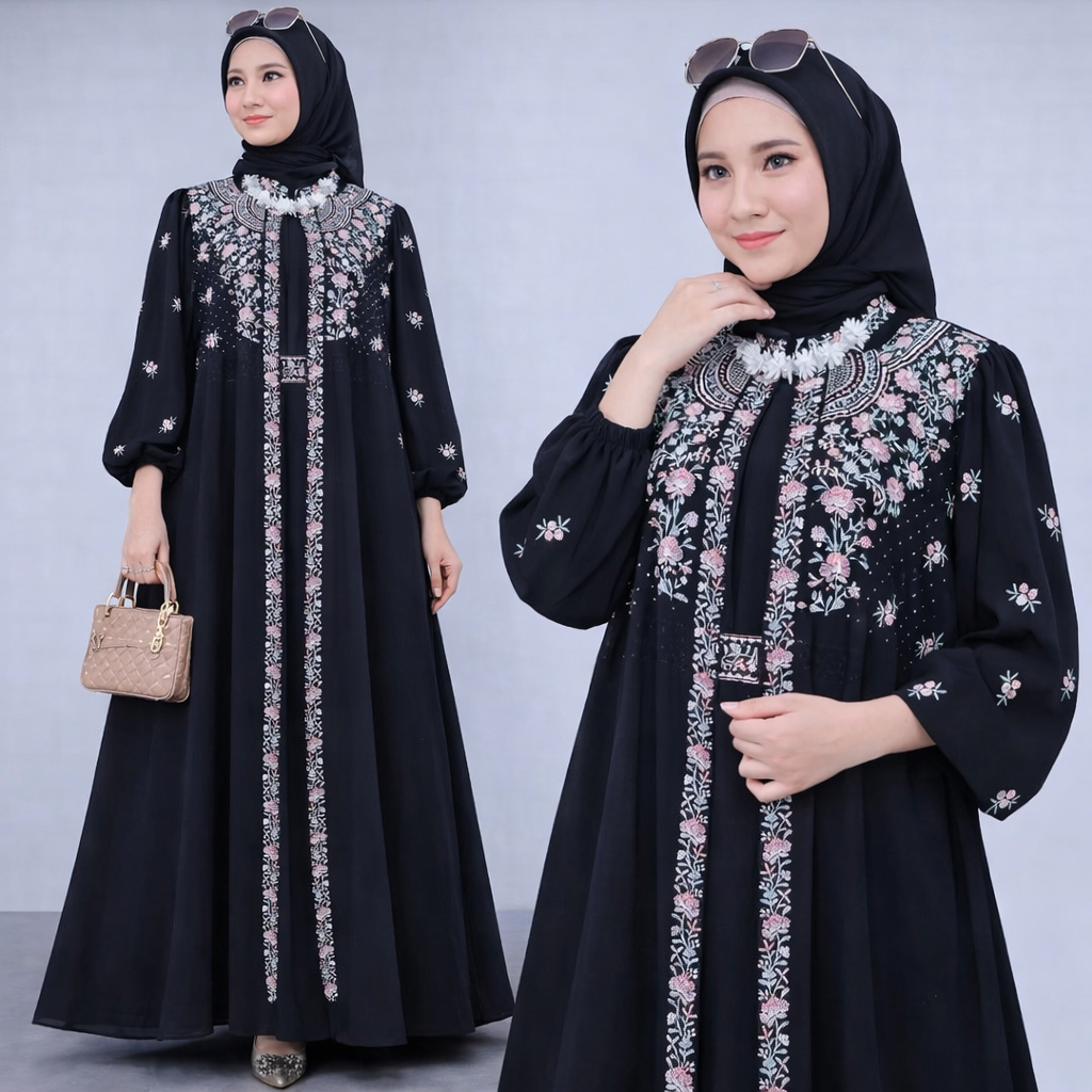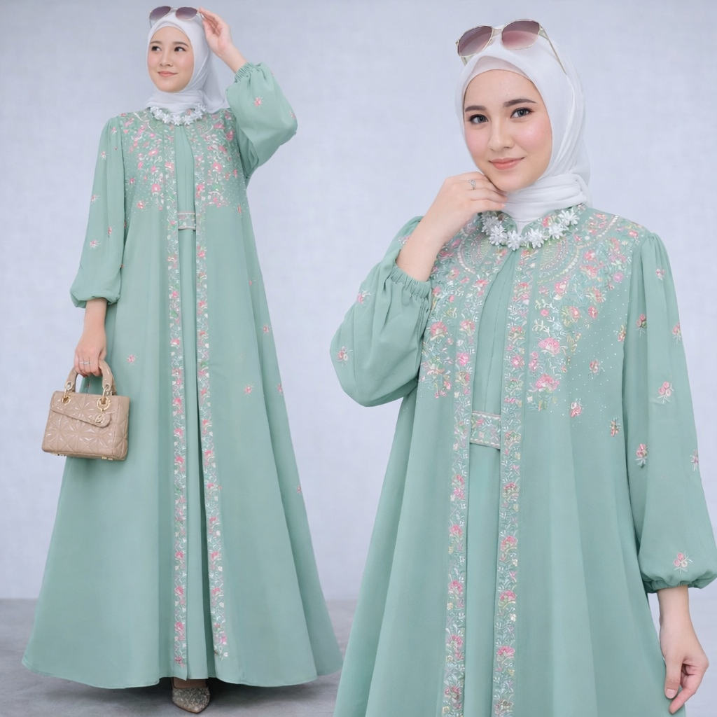 Vallina Outfit Rabbania Maxy Dress Bordir Cape Layer Cerutty Gamis Pesta Kondangan Premium Lebaran