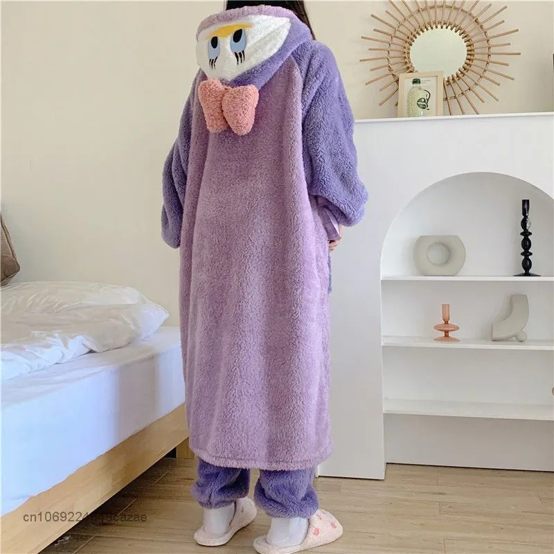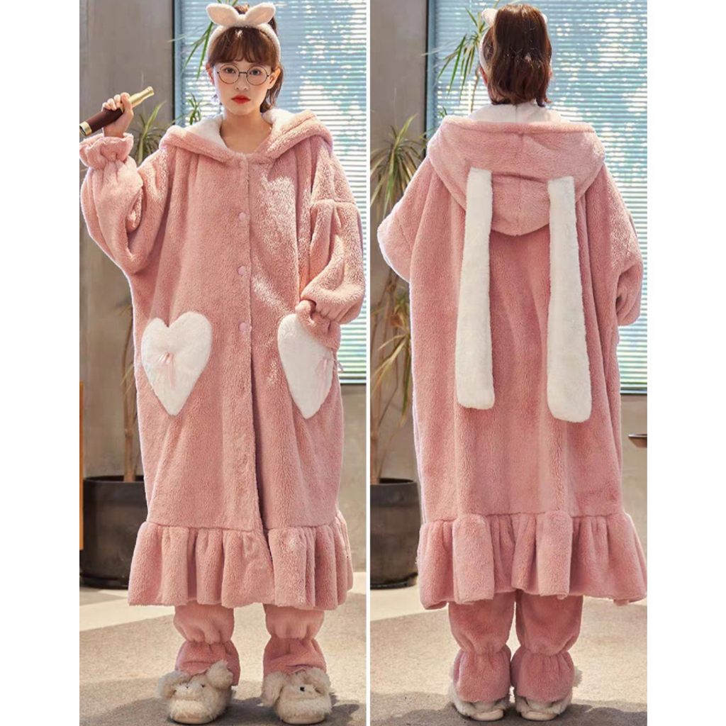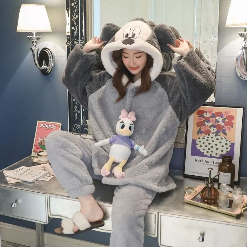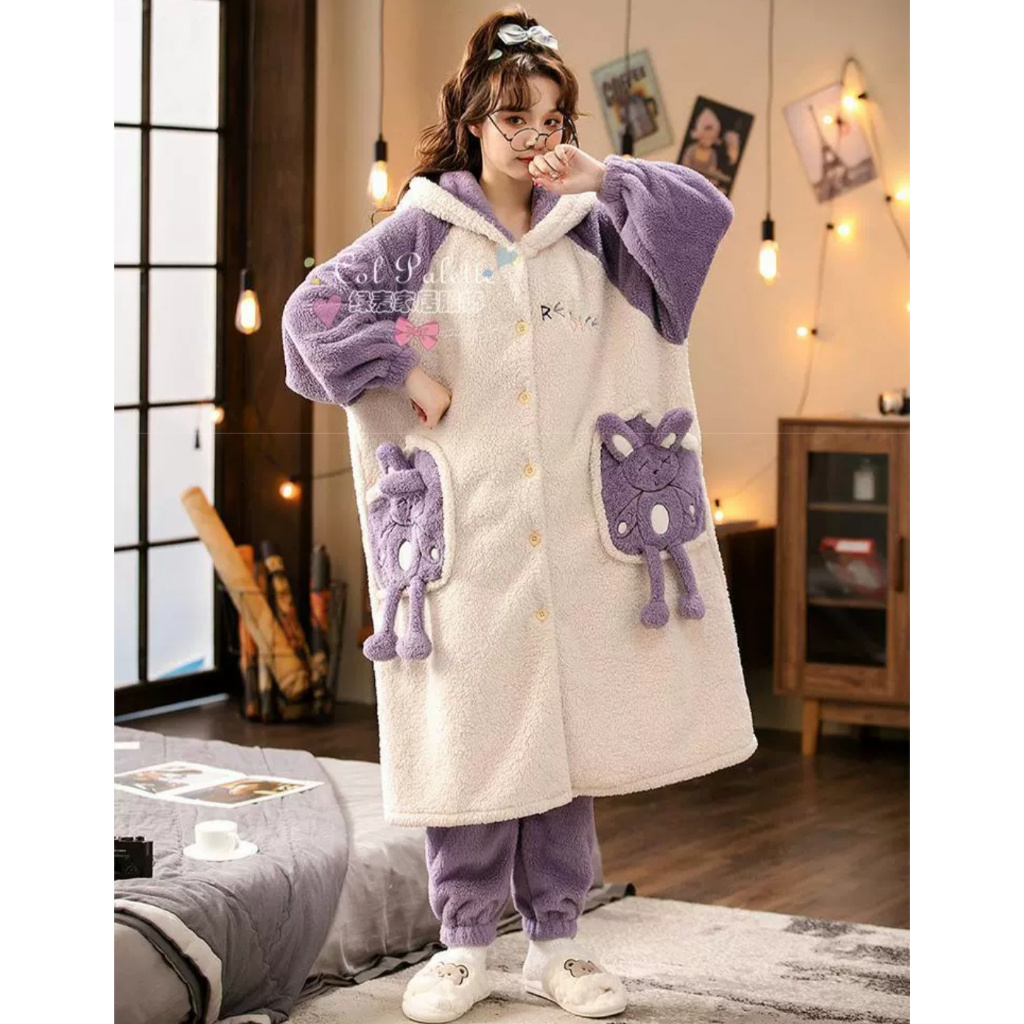 RULIF Piyama bulu hoddie kancing Premium tebal 3D/ Baju tidur bludru topi lengan panjang