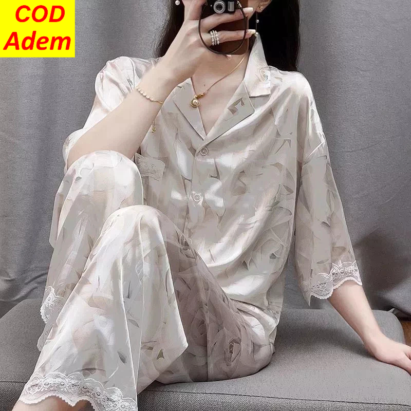 Baju Setelan Piyama Tidur Wanita Kekinian Renda Satin Motif Bunga Pakaian Rumah Wanita Korea Style Terbaru 2025