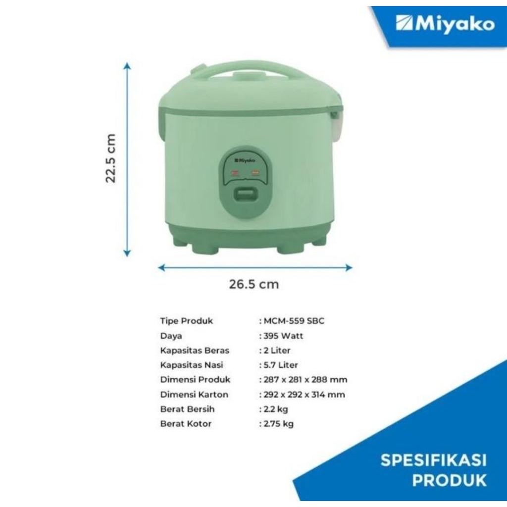 MIYAKO : MCM-559SBC MAGIC COM RICE COOKER 2 LITER 3IN1 MAGIC TONJOLAN NANOAL 395 WATT MCM 559 SBC