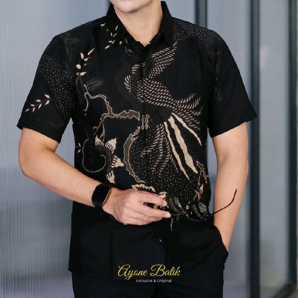 AyoneBatik Hem Batik Pria Terbaru Lengan Pendek Panjang Motif EMPRIT HITAM Batik Cowok Lengan Pendek Kekinian Warna Hitam Lapis Furing Adem Dan Nyaman Dipakai Kemeja Batik Hitam Ekslusif