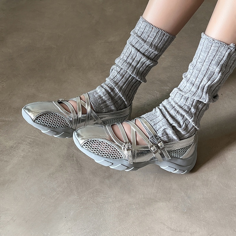 [Stock] Sepatu Mary Jane Gaya Olahraga Kasual 2025 Wanita Musim Panas Sepatu Tunggal Berongga Berpori dengan Rok Sepatu Balet - Penambah Tinggi Badan