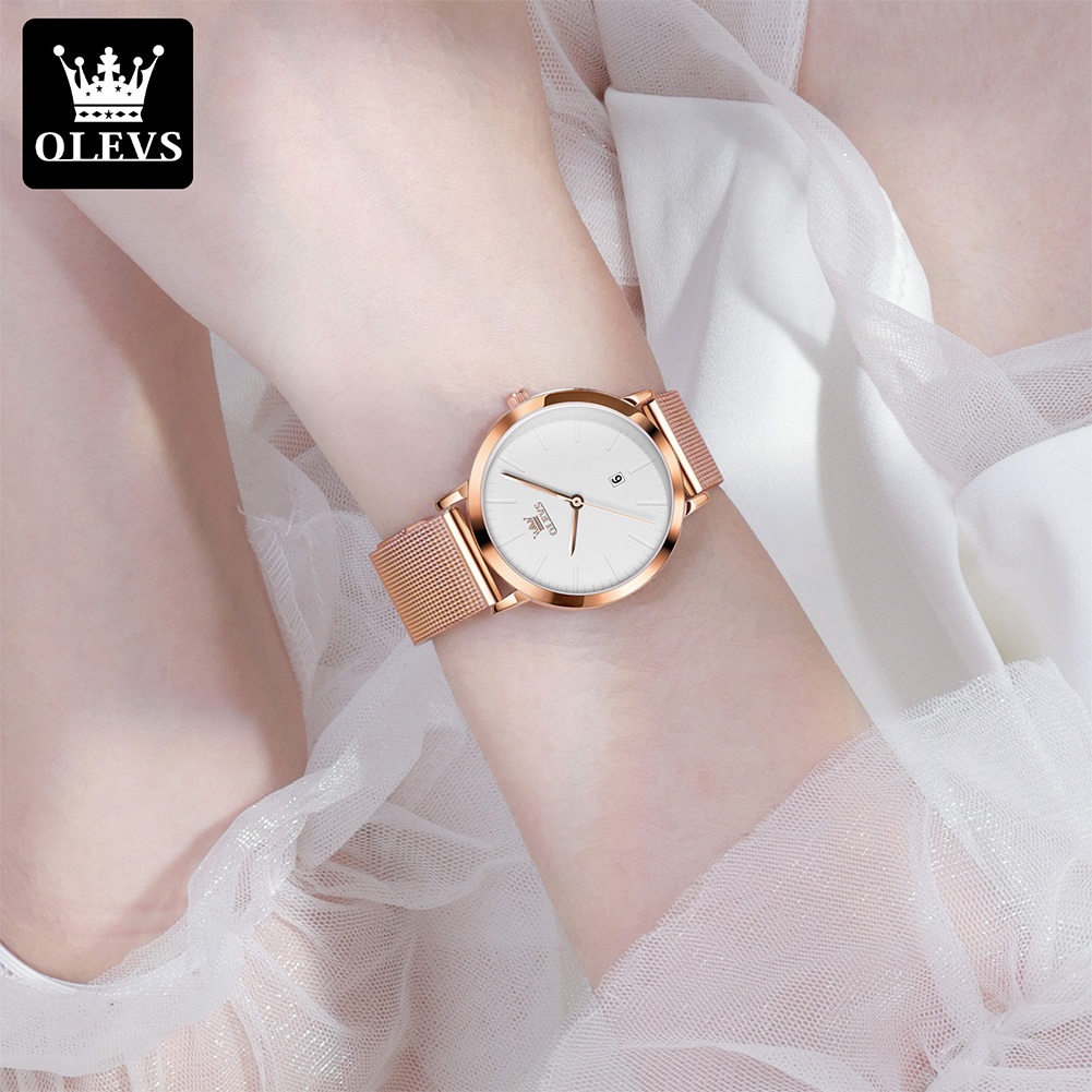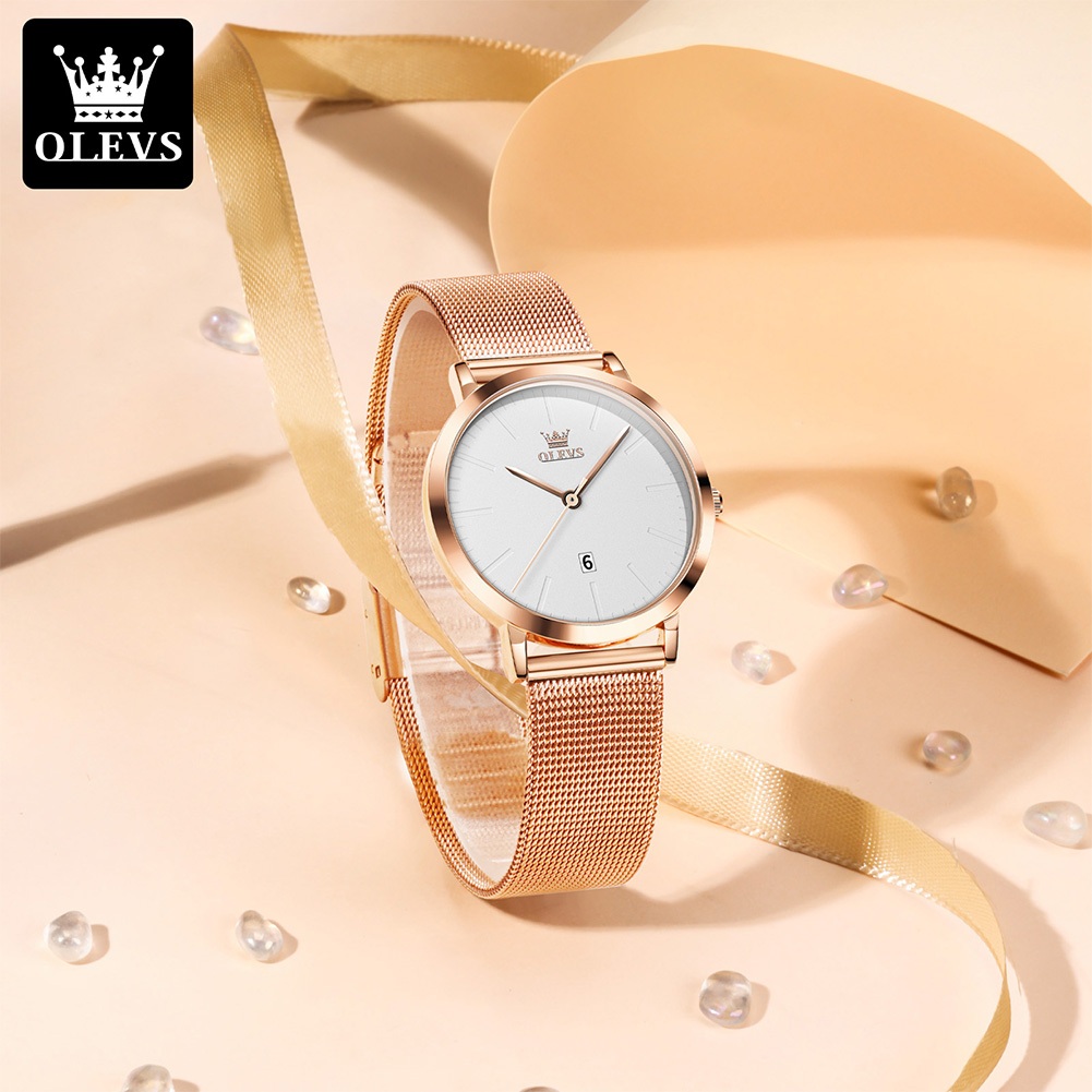 OLEVS Jam Tangan Wanita Elegan Original Anti Air Cewek Korea Analog Quartz Arloji Rantai Stainless Steel Kecil Kalender