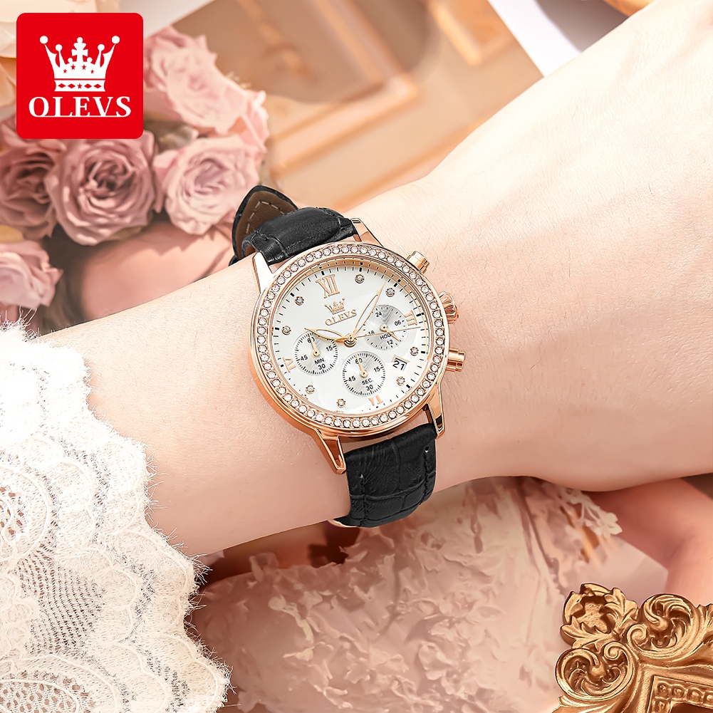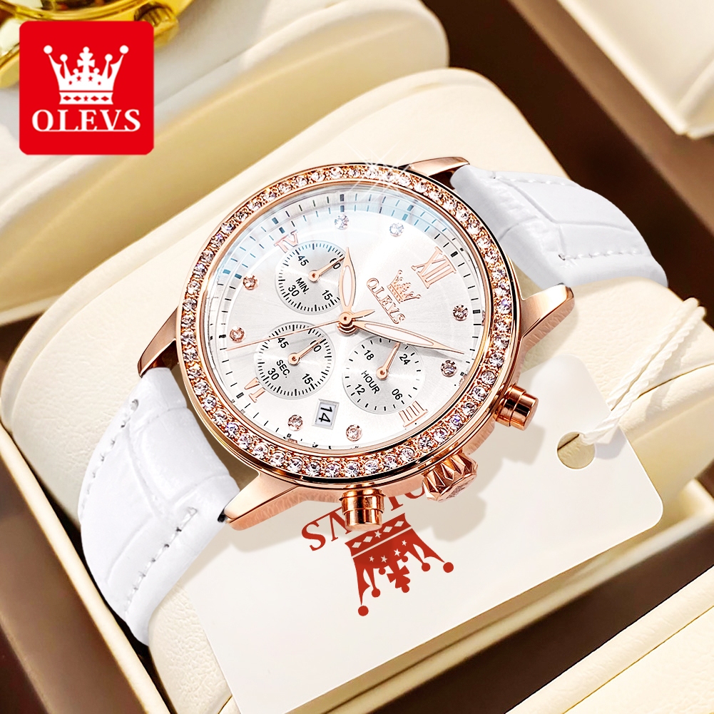 OLEVS Jam Tangan Wanita Anti Air Original Kecil Tahan Tali Kulit Kuarsa Chrono Women Watch Analog Stock el 9933