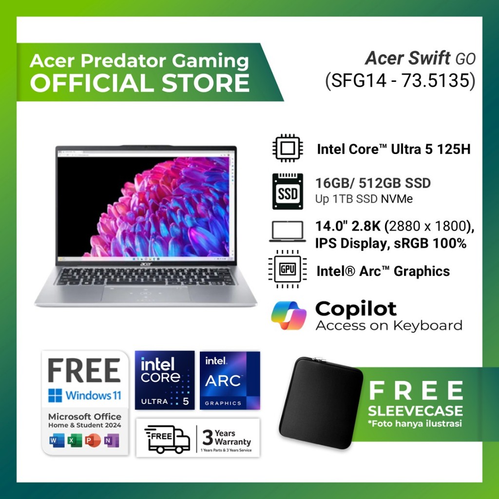 ACER SWIFT GO SFG14-73-5135 ULTRA 5 125H 16GB 512GB WINDOWS 11+OFFICE 14.0INCH 2.8K 100SRGB