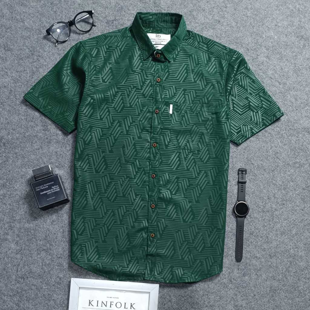 Detak Original Kemeja Embos Pria Lengan Pendek Motif Puzzle Hijau Botol