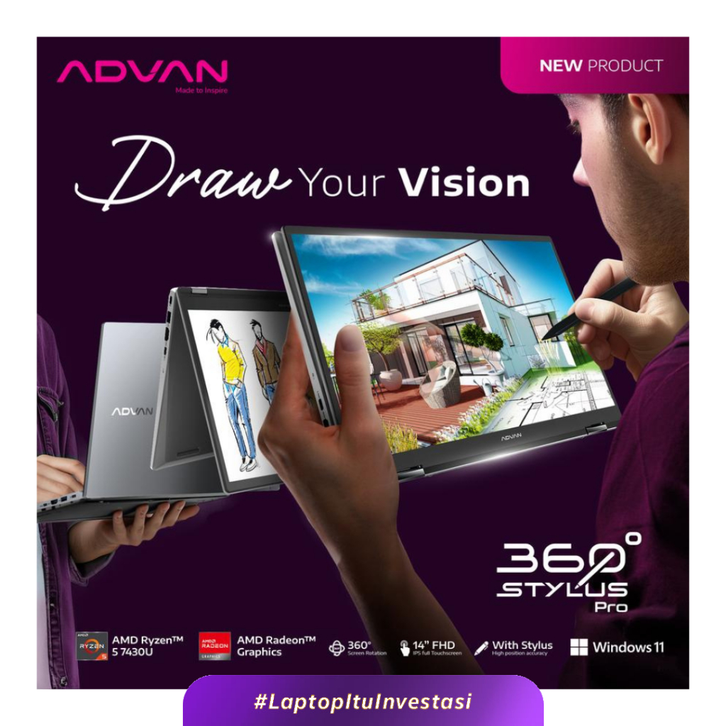 ADVAN Laptop 360 Stylus Pro Laptop 2 in 1 AMD Ryzen 5 7430U 14" IPS FHD Touchschreen 8GB 512GB SSD Upgradeable Windows 11 Original Garansi Resmi