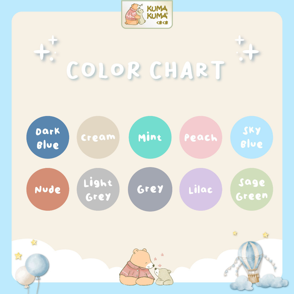 Dark Blue, Cream, Mint, Peach, Sky Blue, Nude, Light Grey, Lilac, Dark Grey, Misty Green