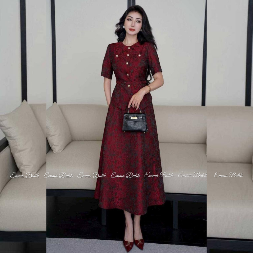 Emma.Butik E00672 Setelan Formal Pesta Mewah Jacquard Wanita Setrok Midi Lengan Pendek Maroon Imlek Bunga Hijau Casual Busui Friendly