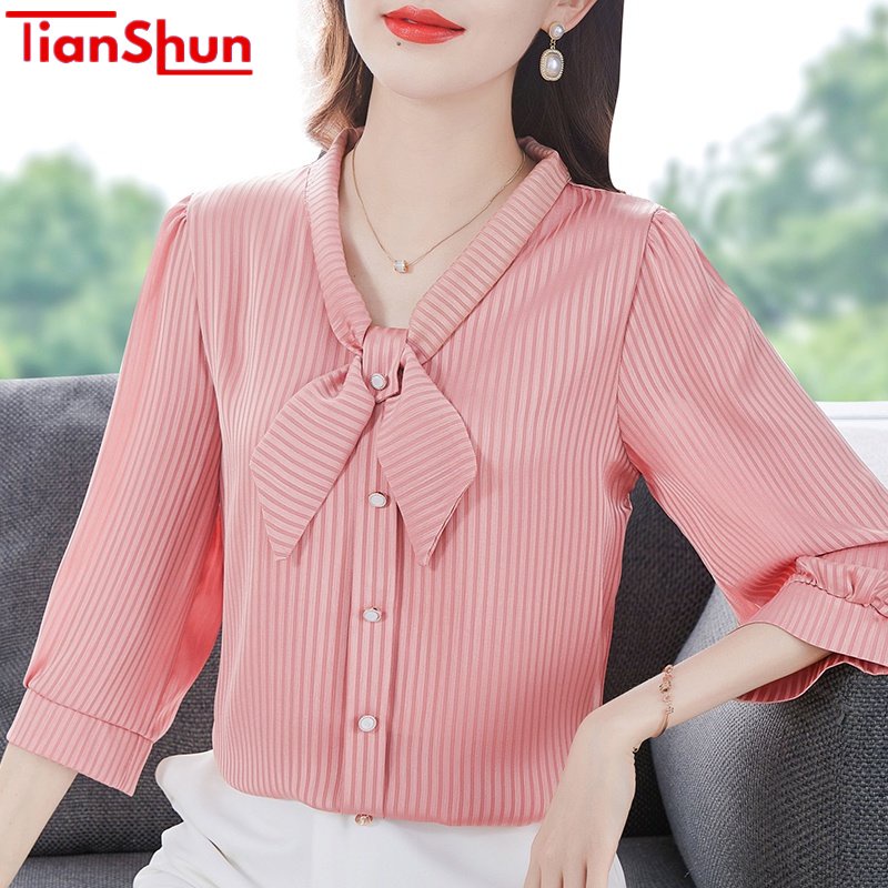 TianShun Korean Style 3/4 Sleeve Casual Work Blouse for Women Blue Pink Green White Summer Shirts