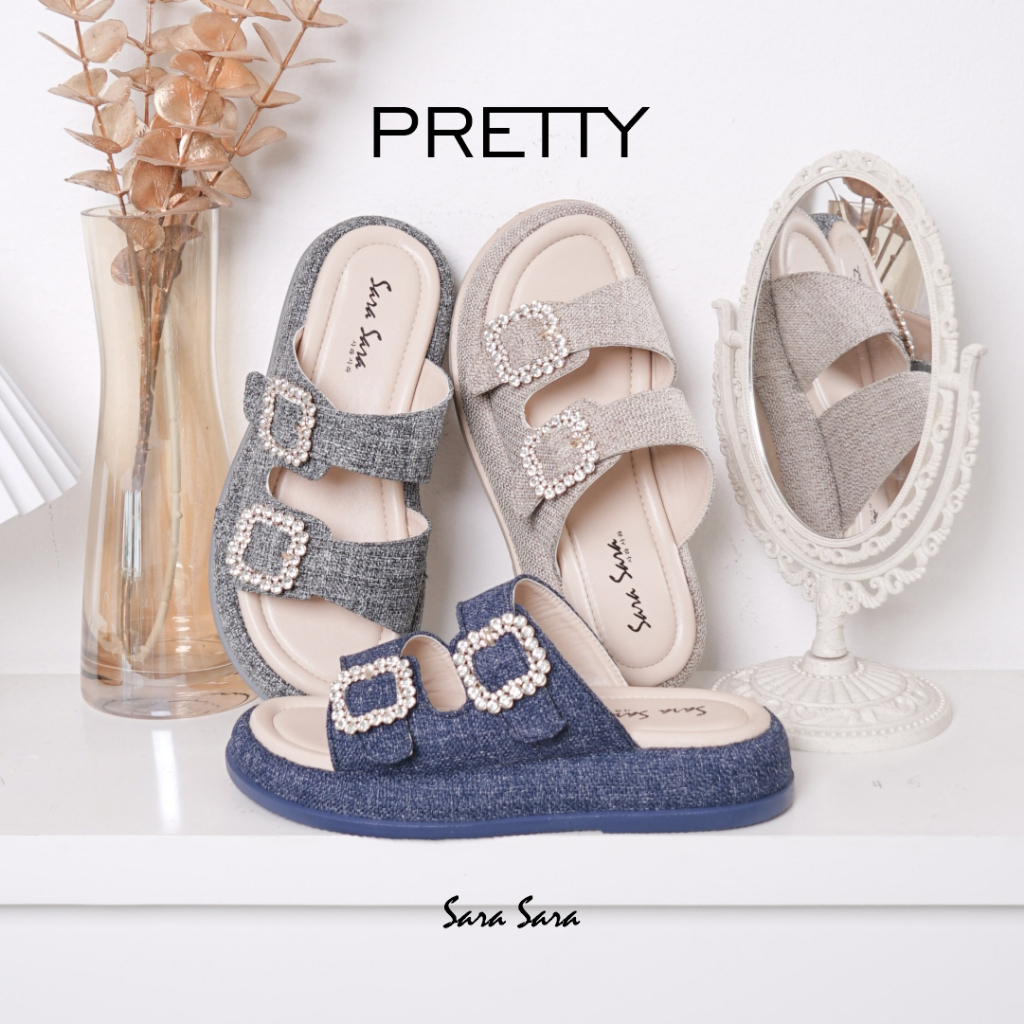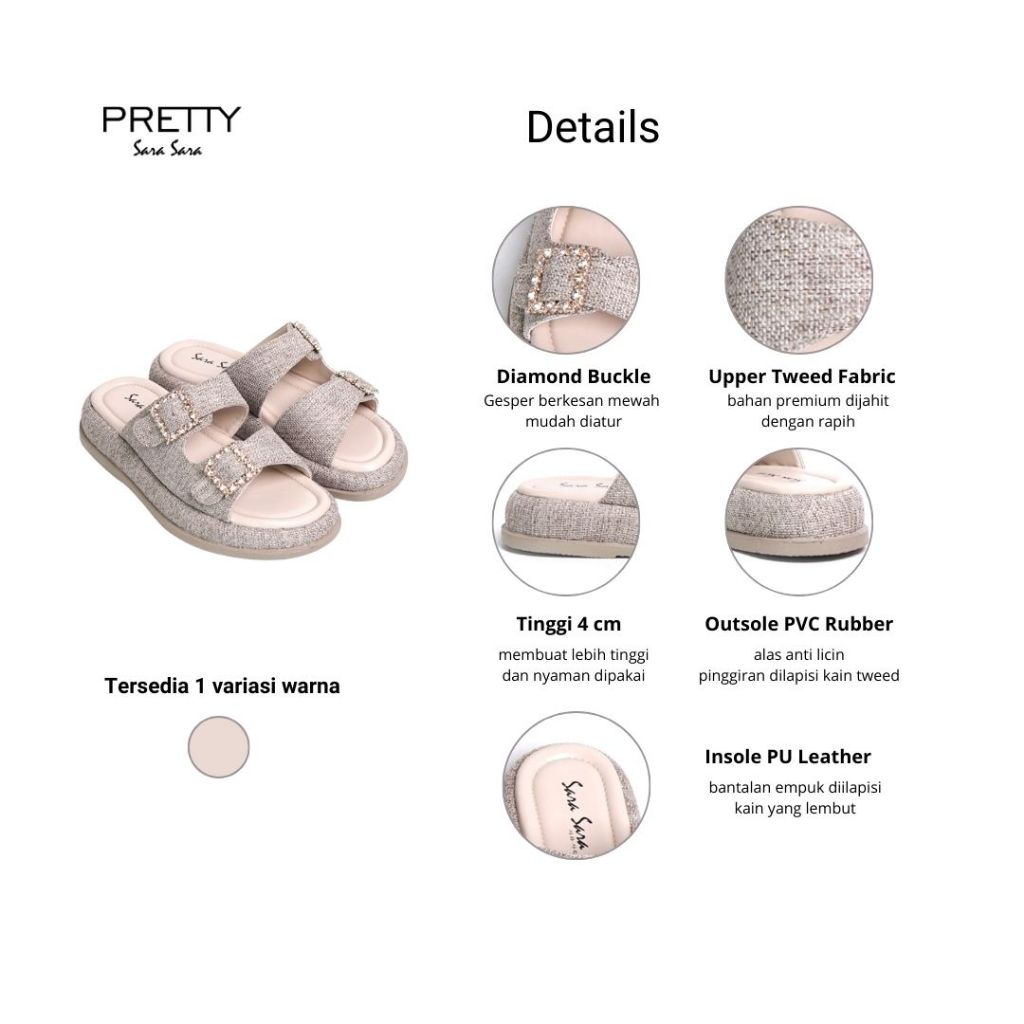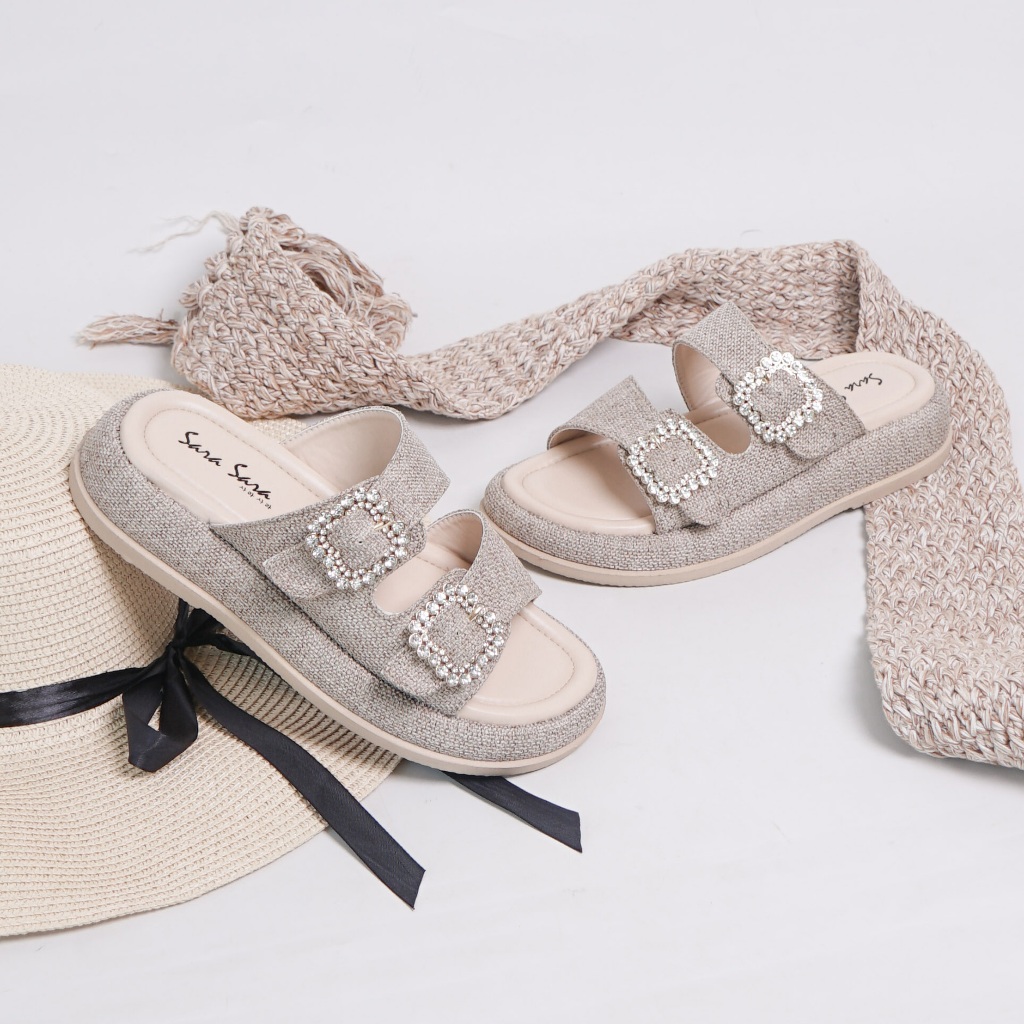 Sara sara Pretty sandal selop wanita platform bahan fabric tweed sendal slop cewek bahan kanvas