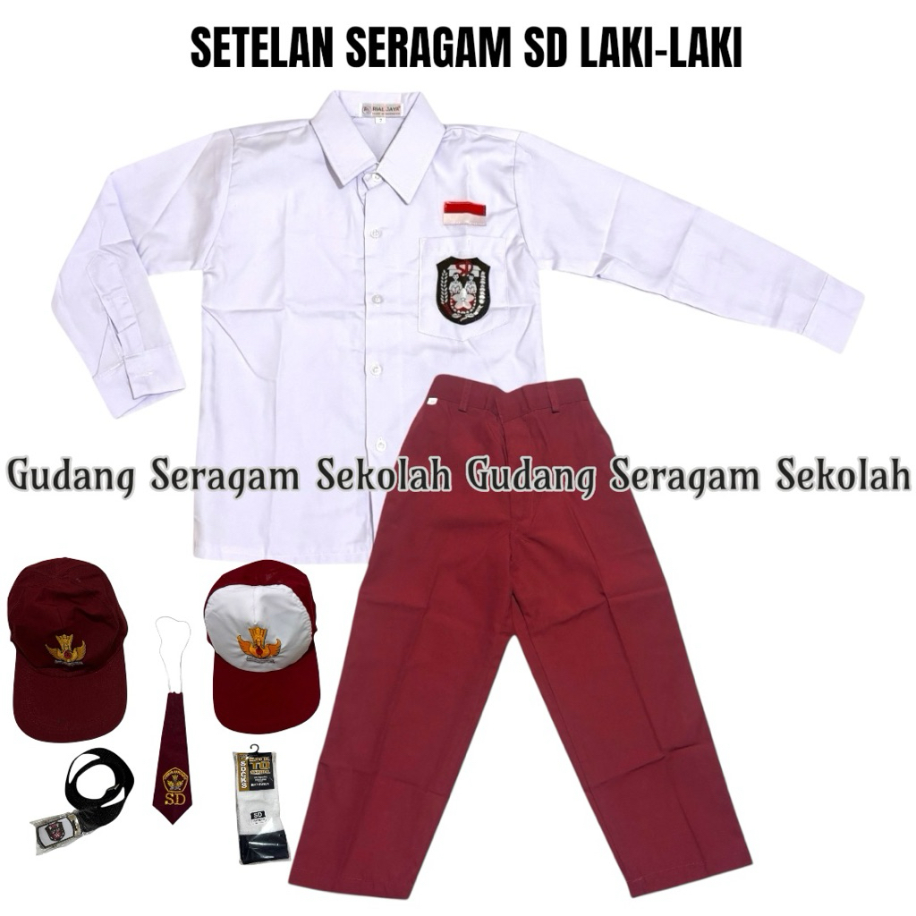 Setelan Lengkap Seragam SD Baju Putih Panjang dan Celana Merah Panjang untuk anak laki-laki