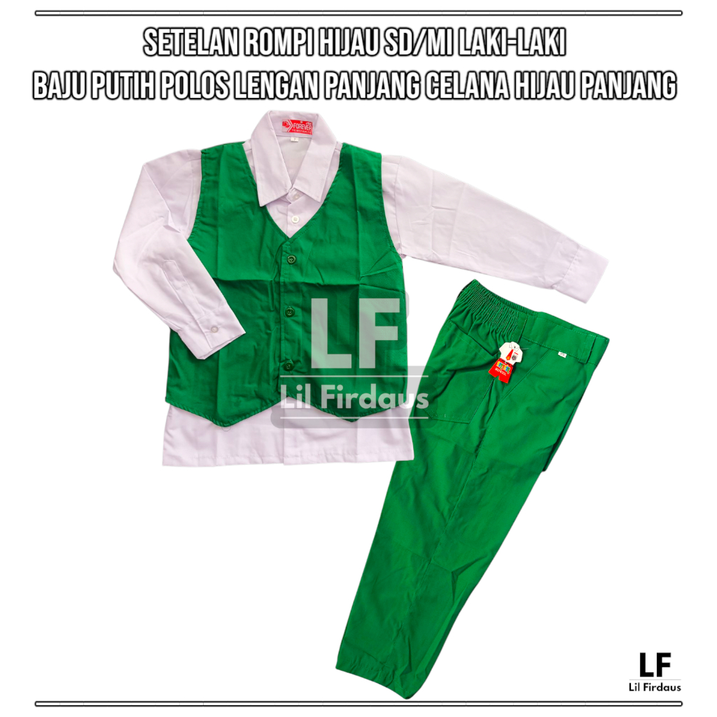 Seragam Sekolah SD MI Satu Setel Baju Polos Lengan Panjang Rompi dan Celana Hijau