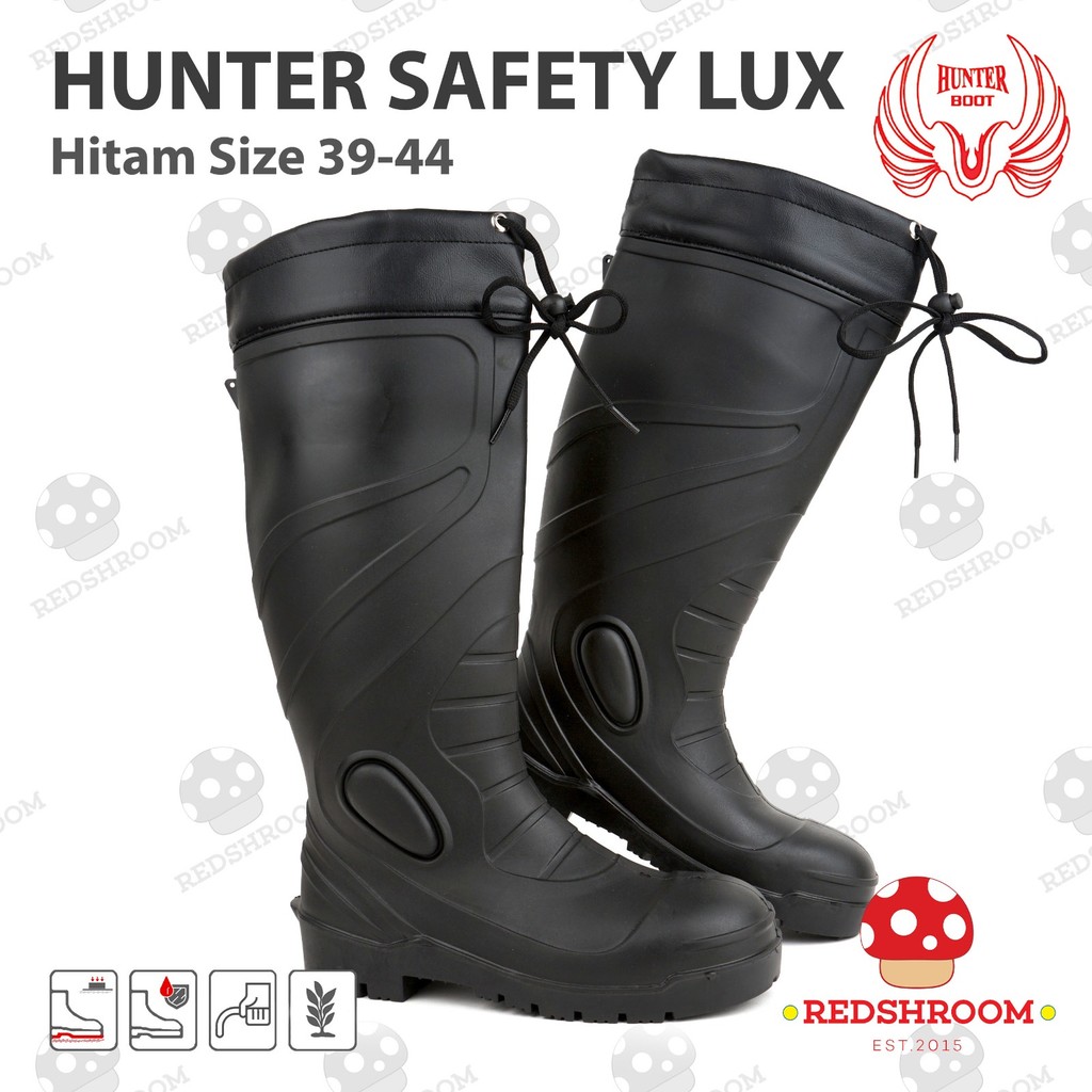 Sepatu Boot Tinggi Hunter Safety Lux Hitam Lentur Ringan Toe Cap Besi Anti Slip & Air Karet Lokal