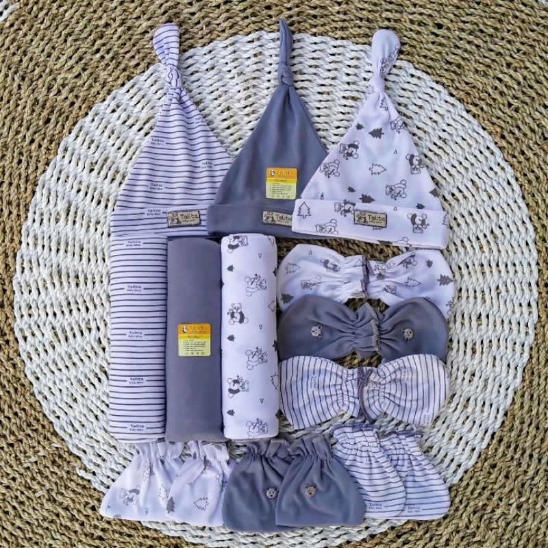 Paket Hemat 12 Pcs Bedong Set Topi Sarung Tangan Kaki Bayi Baru Lahir Newborn Seri Abu Talitababywear