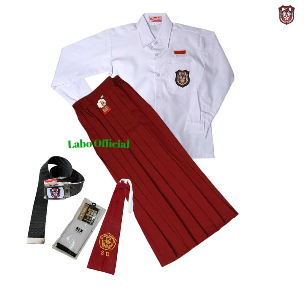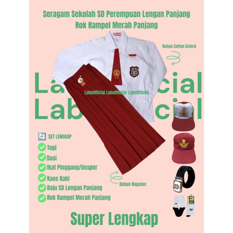 Seragam Sekolah SD Merah Putih Perempuan Lengan Panjang Rok Merah/Setelan Sekolah SD Merah Putih Perempuan Lengan Panjang Dan Rok Panjang Merah