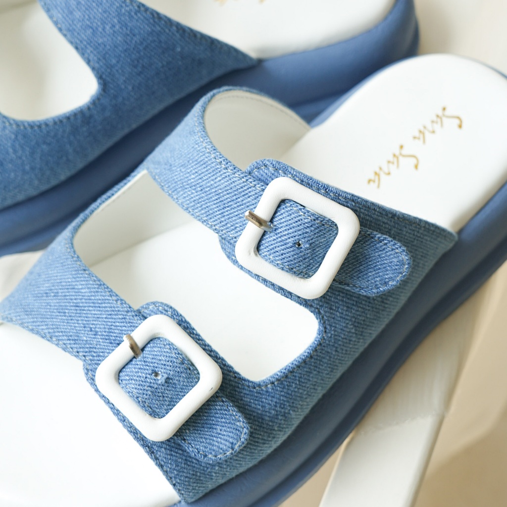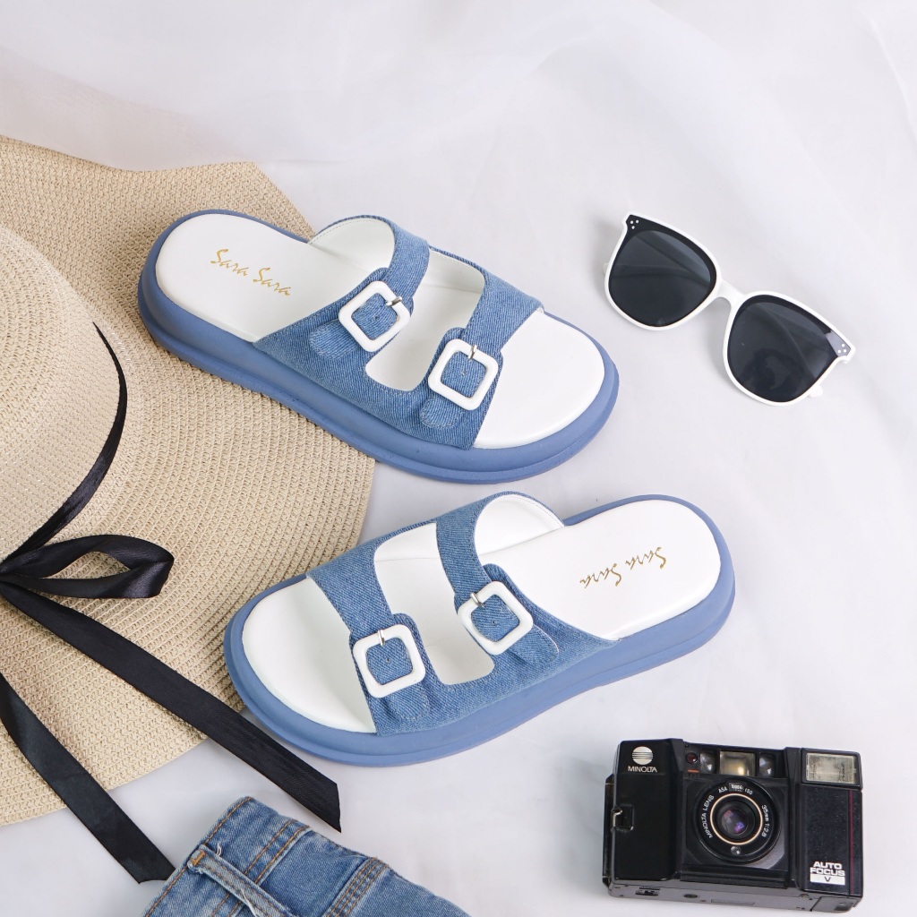 Sara Sara Jolla Sandal Slop Wanita Model Denim Gesper Sol Platform