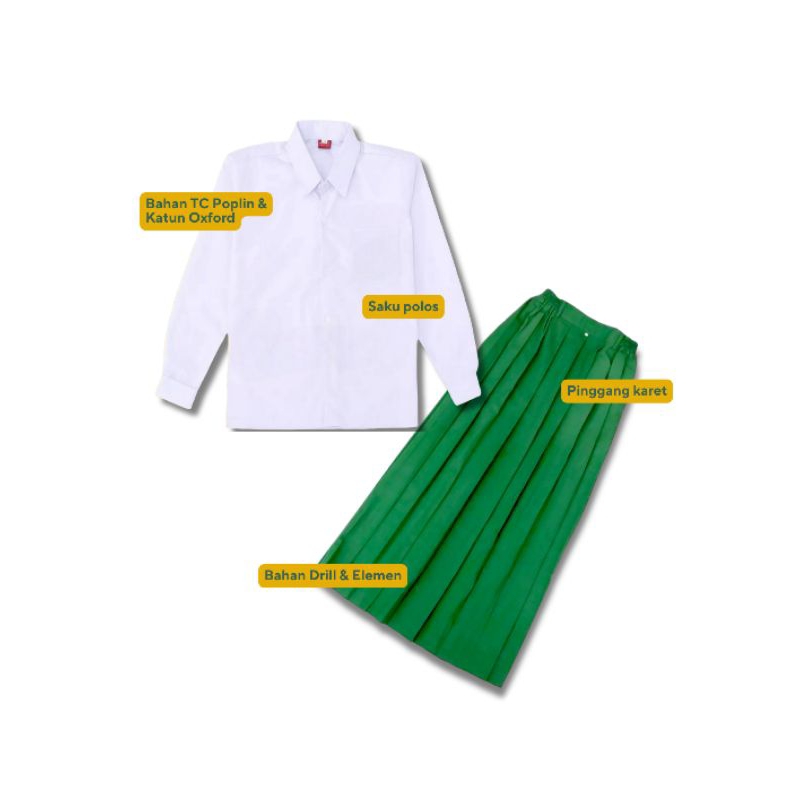 INI SERAGAM - Setelan MI TK Baju Putih los Lengan Panjang Tangan Pendek Celana Panjang Hijau Rok Rempel Plisket Hijau Kemeja Putih los Bawahan Rok Celana Panjang Seragam MI TK