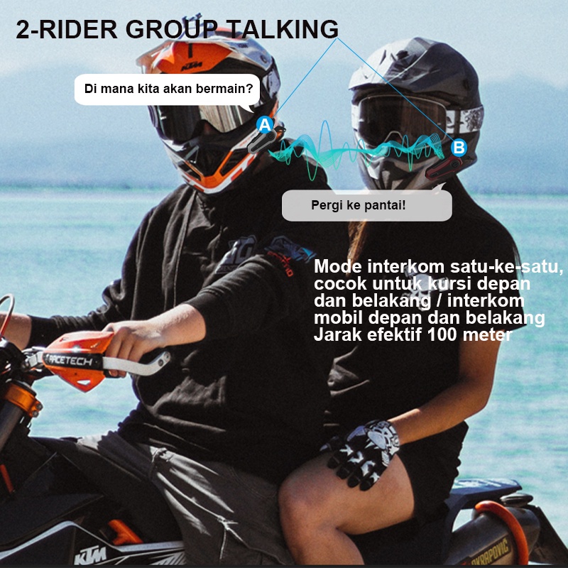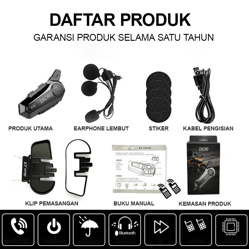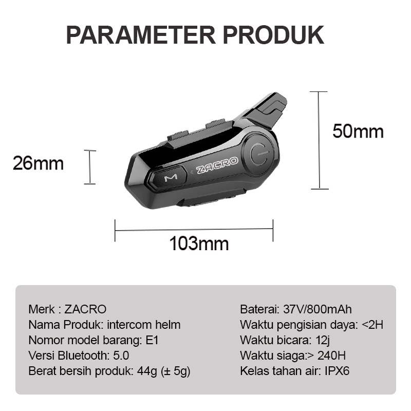 ZACRO E1 Intercom helm Bluetooth 5.0 FM Radio intercom dua arah dan Peringkat tahan air IPX6