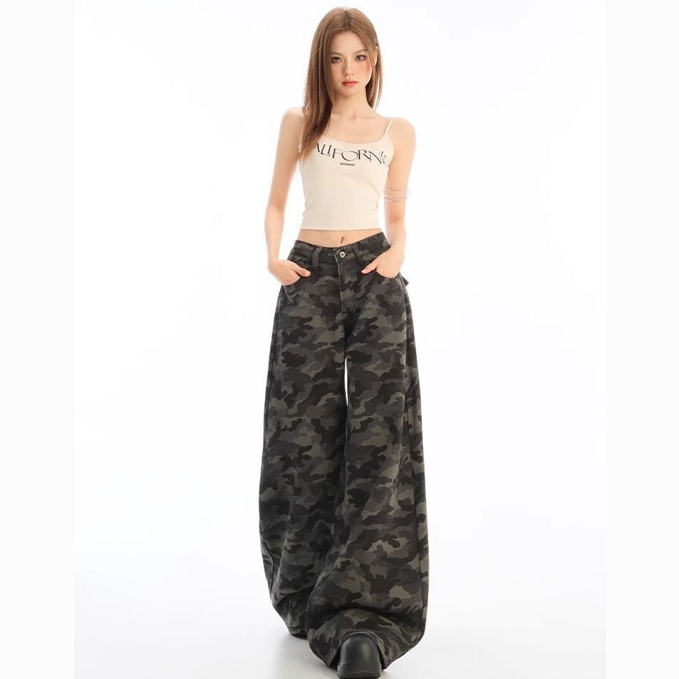 S-6XL Kamuflase Retro Jeans Celana Jeans Wanita Jumbo Celana Casual Lurus Longgar Wanita Korean Pinggang Tinggi Celana Cargo