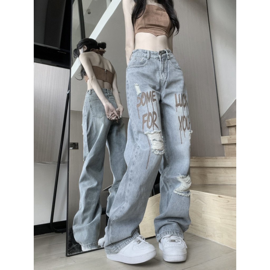S5XL Celana Jeans Robek Retro Pinggang Tinggi Wanita Korea Terbaru Celana Jeans Longgar Kasual Hip-hop