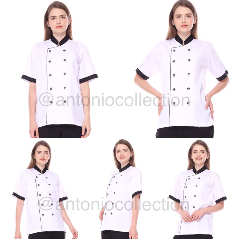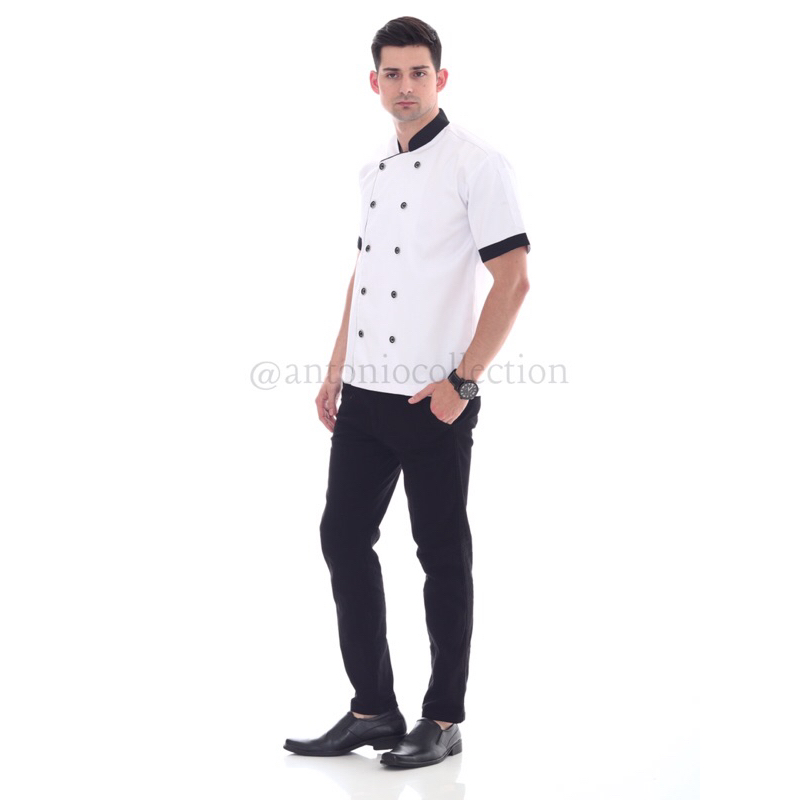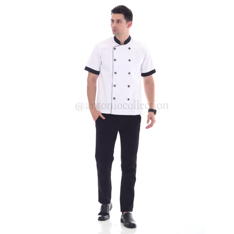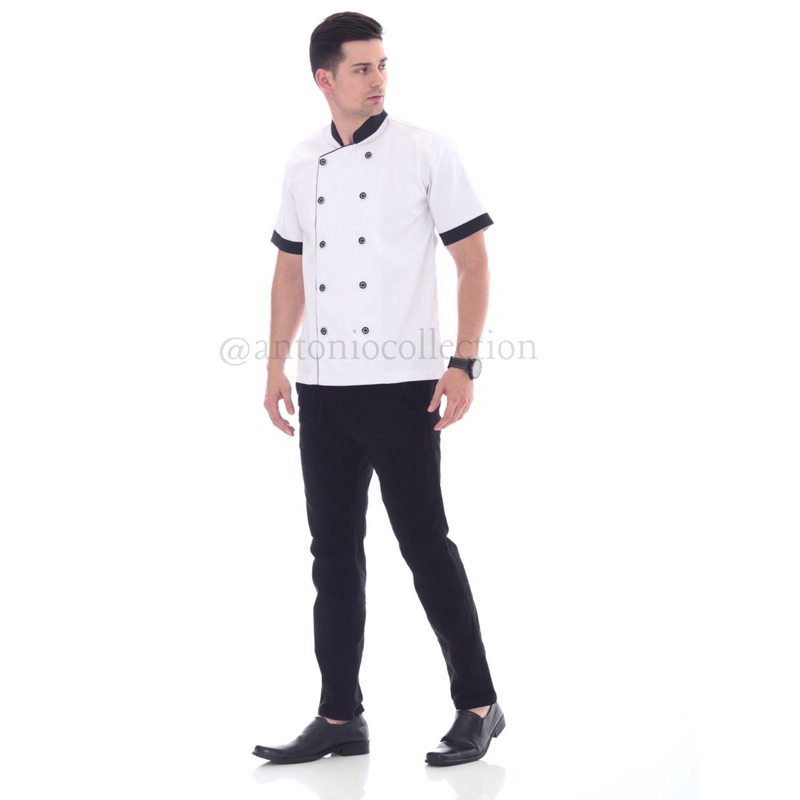 Baju Koki / Chef Jacket Putih Lis Hitam Lengan Pendek
