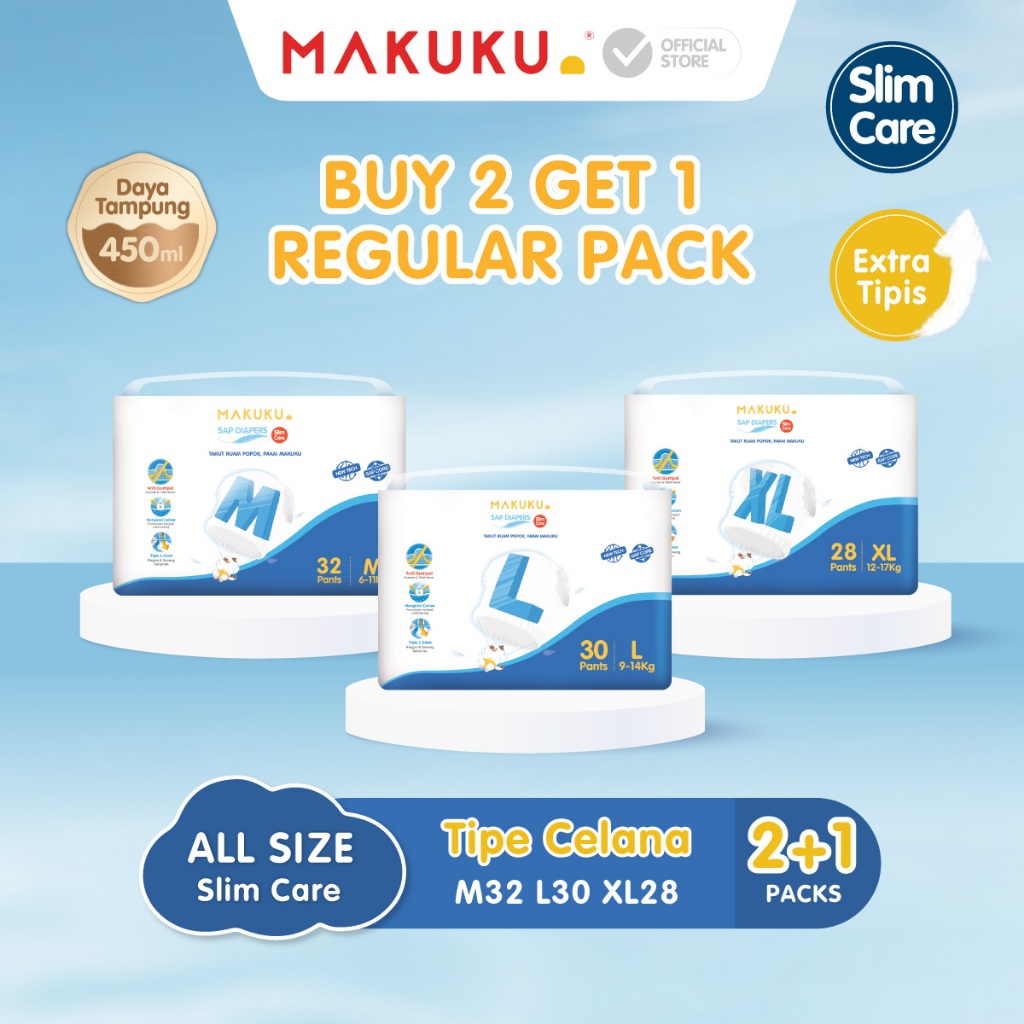 [Buy 2 Get 1 Pack Free] Makuku Sap Diapers Slim Care Pants M/L/Xl/Xxl / Popok Bayi Tipis Extra Dry Anti Gumpal Mengunci