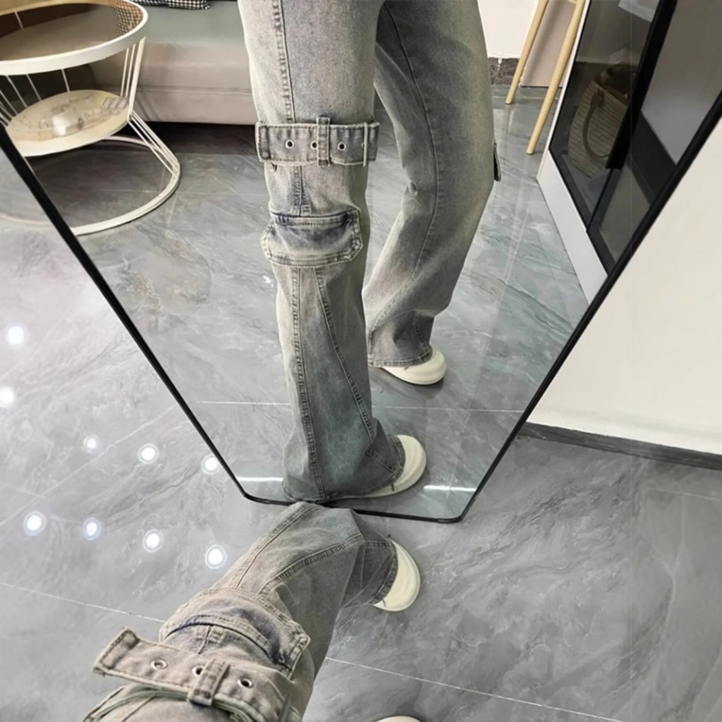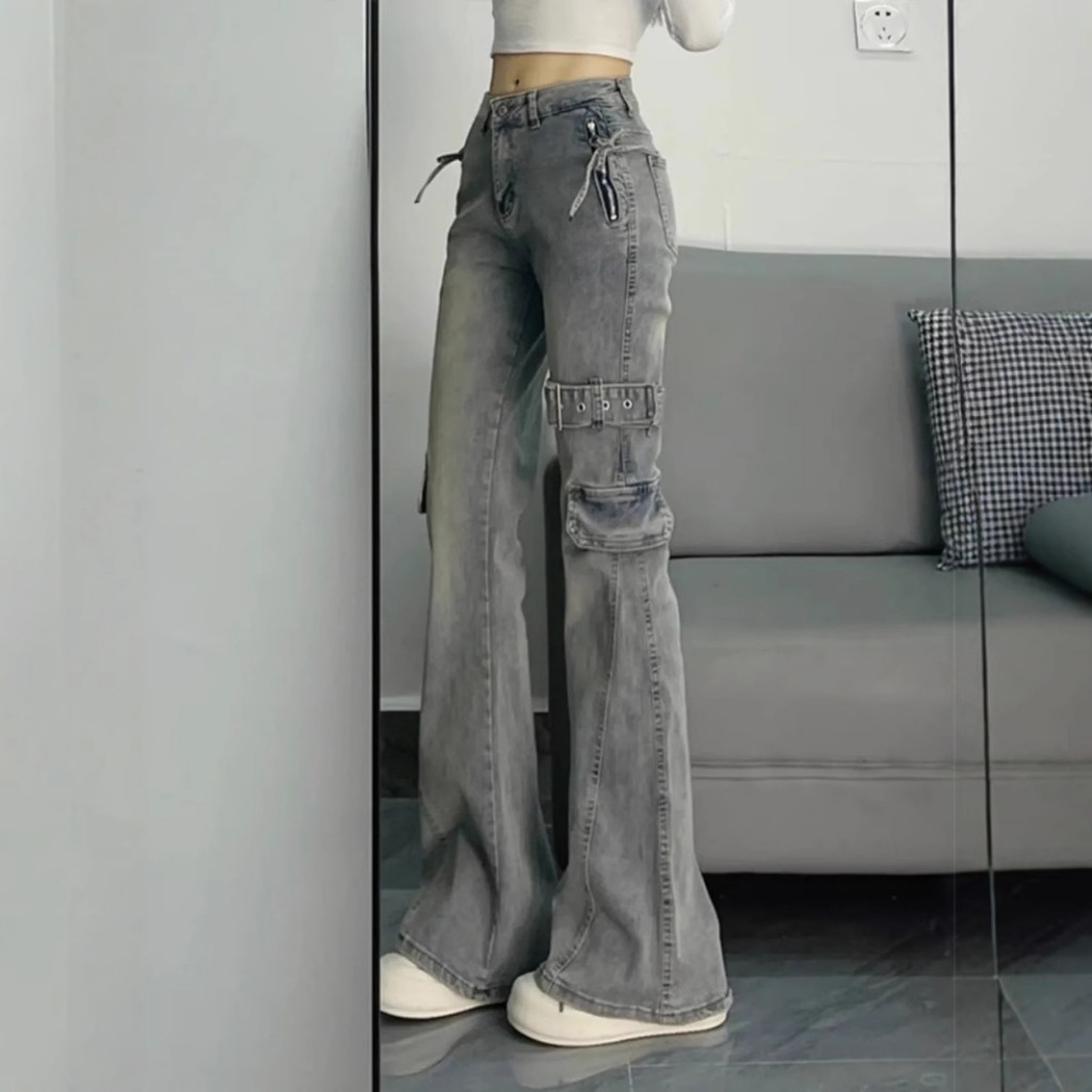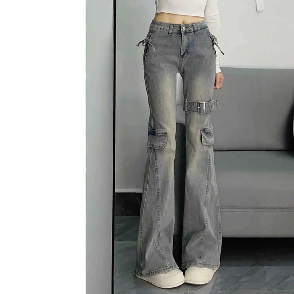 High waist jeans Wanita y2k cutbray kantong motif J090