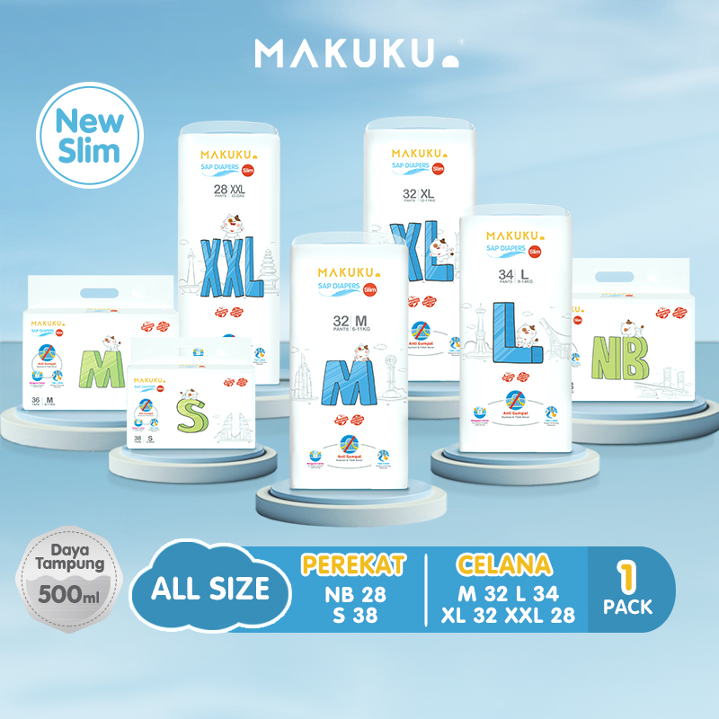[1 Pack] Makuku Sap Diapers Slim / Popok Bayi Tipis Sap Anti Gumpal Cepat Kering Sekali Pakai Tipe / Nb28/S38/M32/L34/Xl