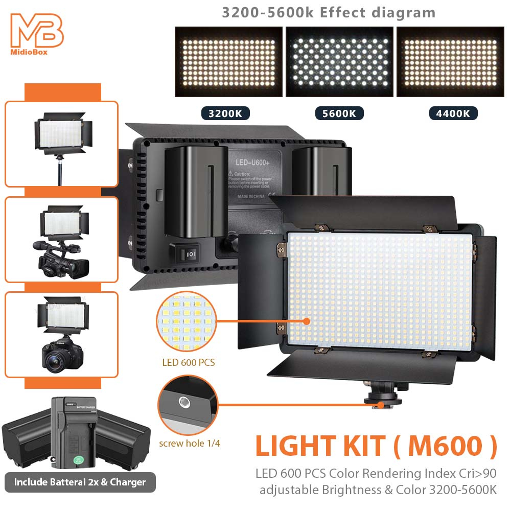 Midio Video Lighting Led M600 Kit Lengkap 2X Baterai Dan Charger Adaptor Livestream Lighting Lampu Jualan Online